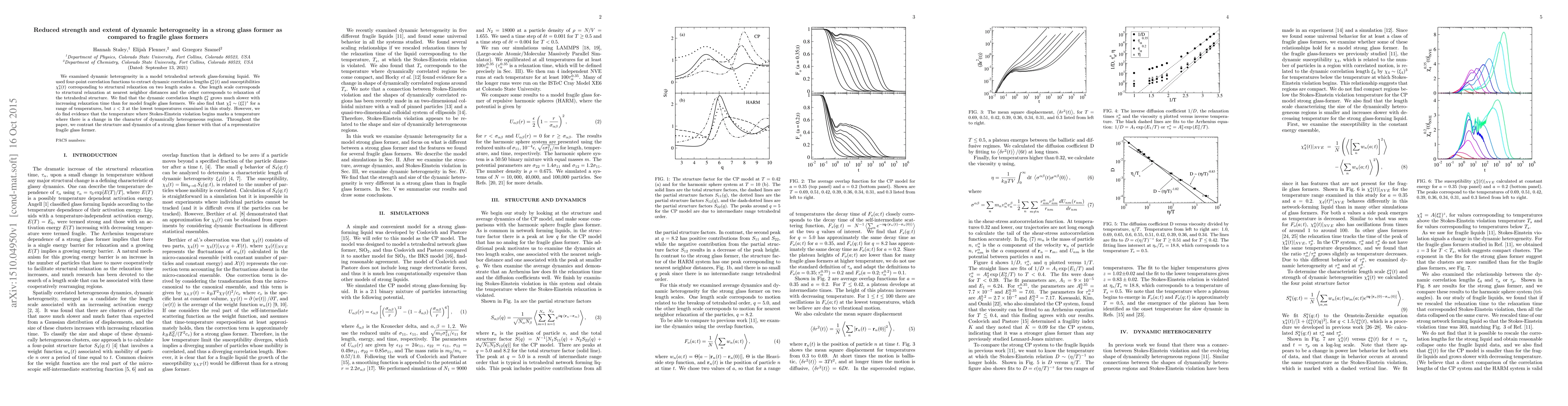 We examined dynamic heterogeneity in a model tetrahedral network glass-forming liquid. We used four-point correlation functions to extract dynamic correlation lengths xi_4^a(t) and susceptibilities chi_4^a(t) corresponding to structural relaxation on two length scales a. One length scale corresponds to structural relaxation at nearest neighbor distances and the other corresponds to relaxation of the tetrahedral structure. We find that the dynamic correlation length xi_4^{a} grows much slower with increasing relaxation time than for model fragile glass formers. We also find that chi_4^a ~ (xi_4^a)^z for a range of temperatures, but z < 3 at the lowest temperatures examined in this study. However, we do find evidence that the temperature where Stokes-Einstein violation begins marks a temperature where there is a change in the character of dynamically heterogeneous regions. Throughout the paper, we contrast the structure and dynamics of a strong glass former with that of a representative fragile glass former.