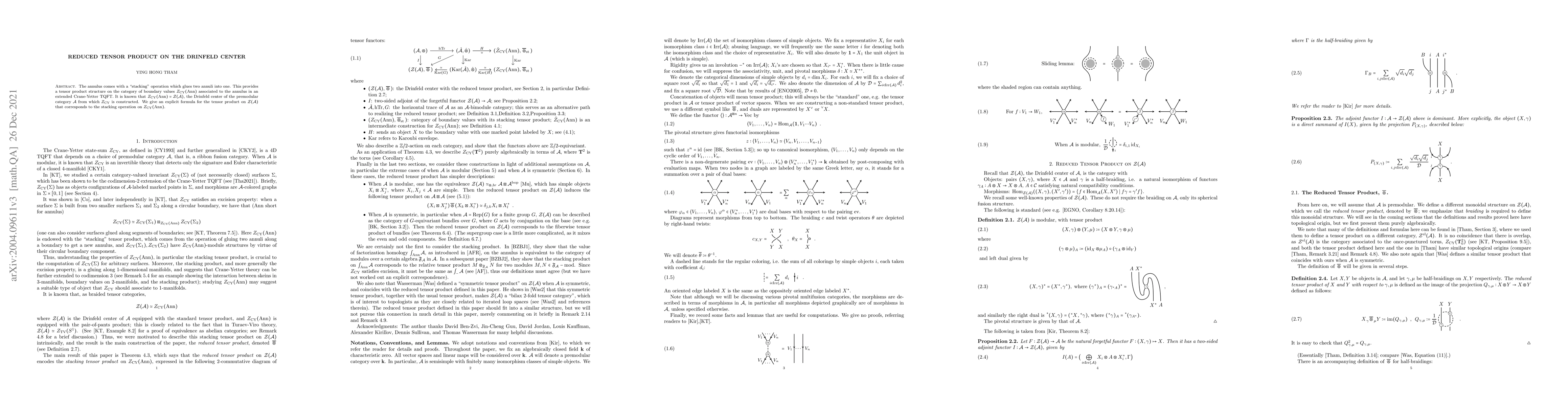 This paper provides an explicit formula for the tensor product structure on the Drinfeld center $\mathcal{Z}(\mathcal{A})$, corresponding to the "stacking" operation on the boundary values $Z_{\text{CY}}(\text{Ann})$ in an extended Crane-Yetter topological quantum field theory. The tensor product on $\mathcal{Z}(\mathcal{A})$ is derived from the operation that merges two annuli into one.