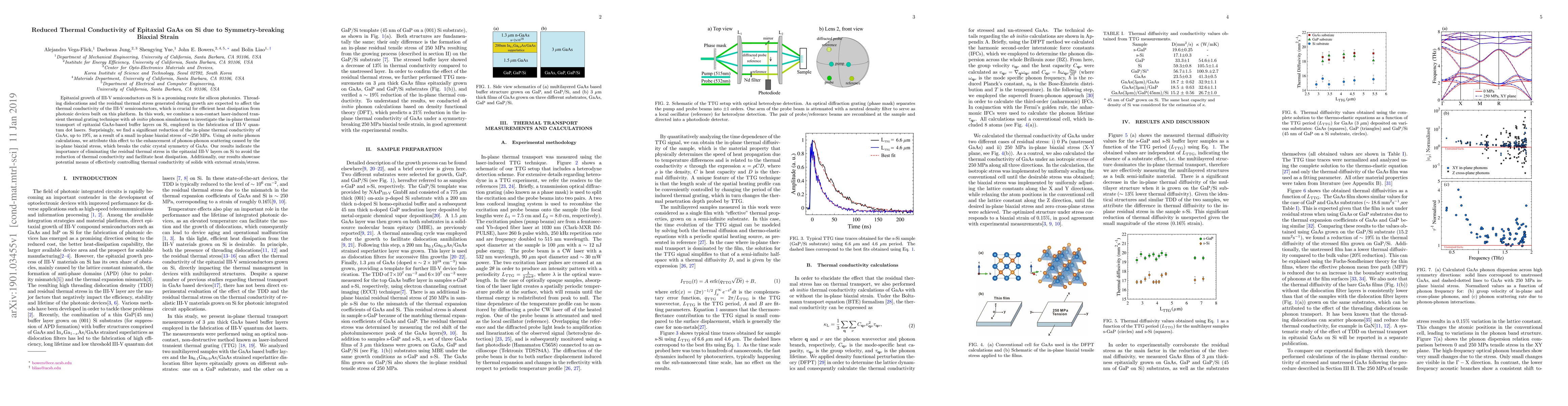 This study investigates the thermal conductivity of epitaxial GaAs on Si, revealing a 19% reduction due to in-plane biaxial strain. The work combines experimental and computational methods to show that the strain enhances phonon-phonon scattering, breaking GaAs's cubic symmetry and thus lowering thermal conductivity.