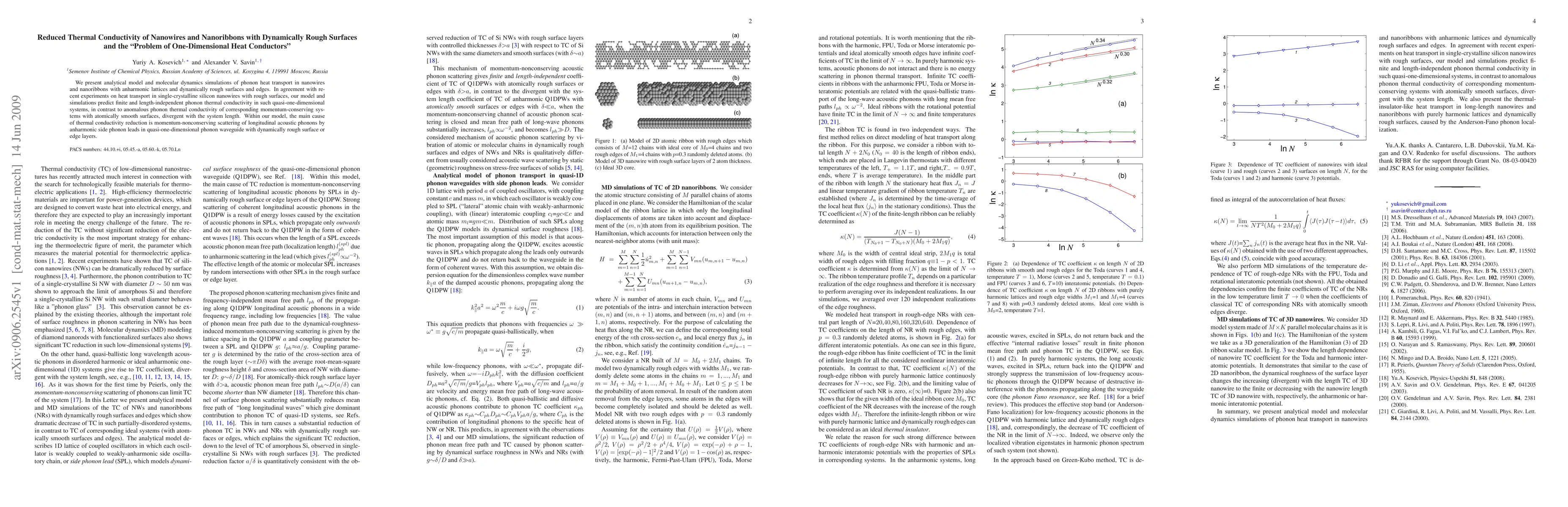 This paper presents an analytical model and molecular dynamics simulations showing that phonon heat transport in nanowires and nanoribbons with dynamically rough surfaces results in finite and length-independent thermal conductivity, contrasting with the divergent thermal conductivity of smooth-surface systems. The reduction is primarily due to nonconserving scattering of phonons by anharmonic side phonon leads.