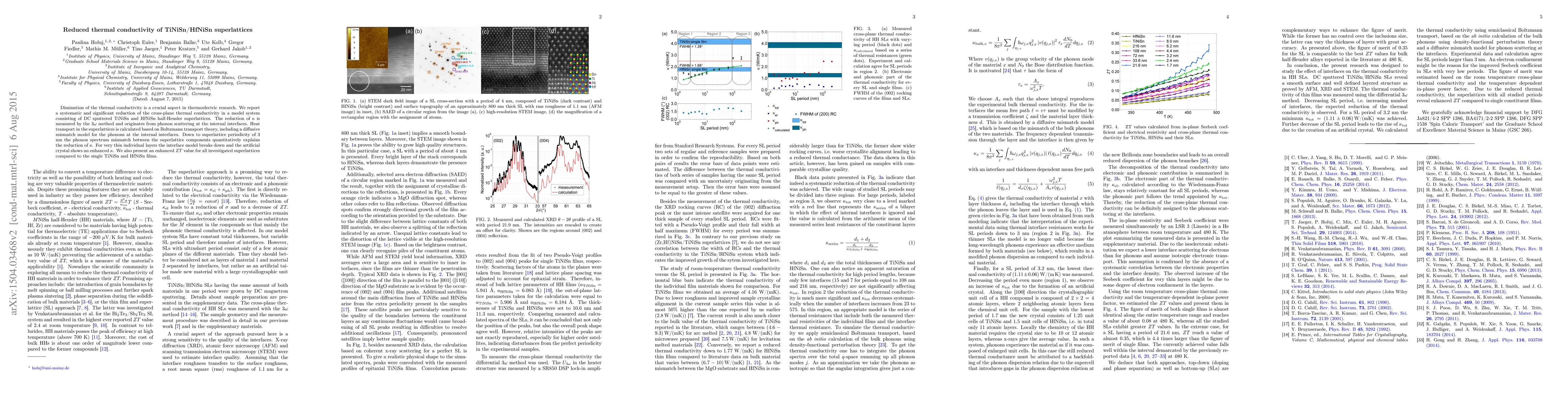 This paper reports a significant reduction in the thermal conductivity of TiNiSn/HfNiSn superlattices due to phonon scattering at the internal interfaces, measured using the 3ω method. The study finds an enhanced thermoelectric performance (ZT value) for the superlattices compared to single films.