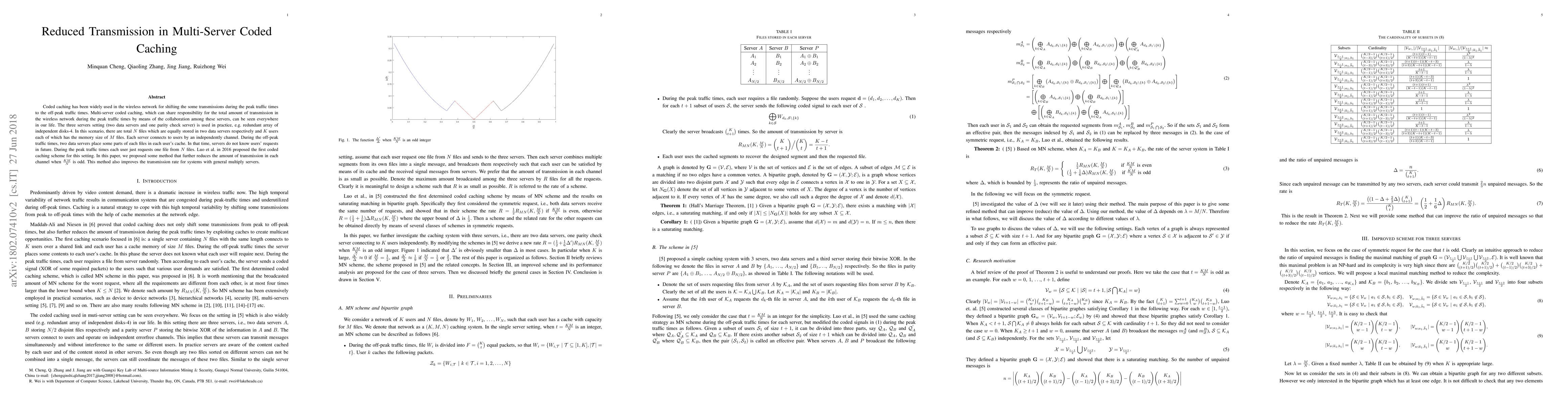 Coded caching has been widely used in the wireless network for shifting the some transmissions during the peak traffic times to the off-peak traffic times. Multi-server coded caching, which can share responsibility for the total amount of transmission in the wireless network during the peak traffic times by means of the collaboration among these servers, can be seen everywhere in our life. The three servers setting (two data servers and one parity check server) is used in practice, e.g. redundant array of independent disks-4. In this scenario, there are total $N$ files which are equally stored in two data servers respectively and $K$ users each of which has the memory size of $M$ files. Each server connects to users by an independently channel. During the off-peak traffic times, two data servers place some parts of each files in each user's cache. In that time, servers do not know users' requests in future. During the peak traffic times each user just requests one file from $N$ files. Luo et al. in 2016 proposed the first coded caching scheme for this setting. In this paper, we proposed some method that further reduces the amount of transmission in each channel when $\frac{KM}{N}$ is odd. This method also improves the transmission rate for systems with general multiply servers.