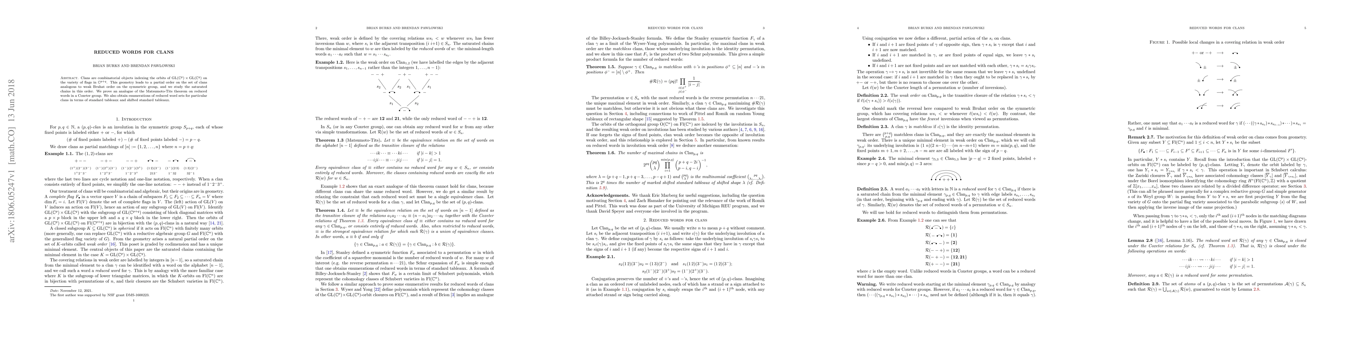 This research studies clans, combinatorial objects indexing orbits of certain linear groups on flag varieties, and explores their geometry. It proves an analogue of the Matsumoto-Tits theorem on reduced words and provides enumerations of reduced word sets for specific clans linked to standard and shifted standard tableaux.