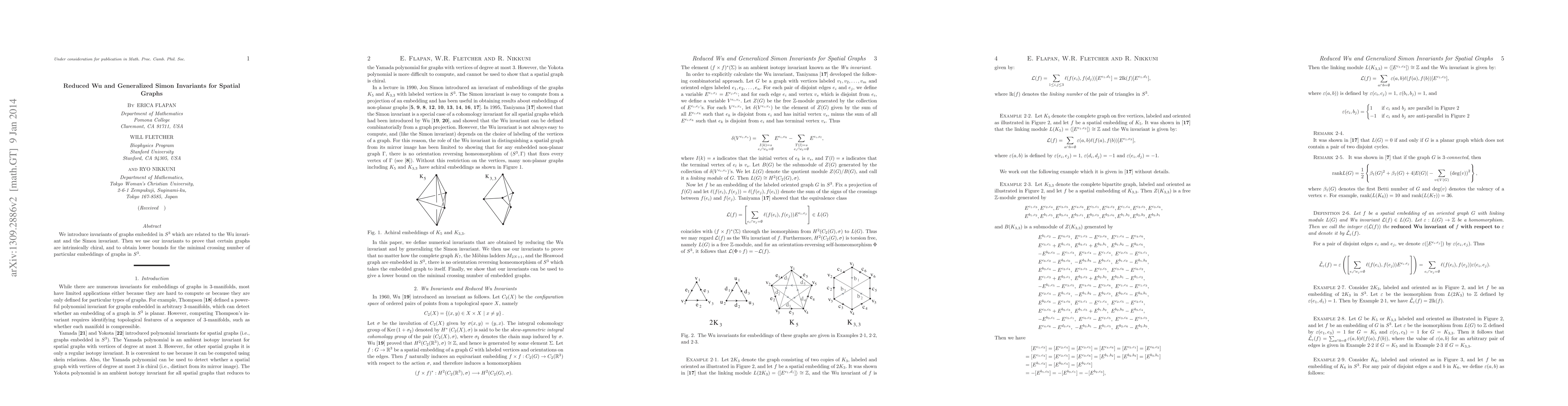 This paper introduces new invariants—Reduced Wu and Generalized Simon invariants—for spatial graphs, demonstrating their utility in proving intrinsic chirality of certain graphs and establishing lower bounds for the minimal crossing number of embedded graphs.