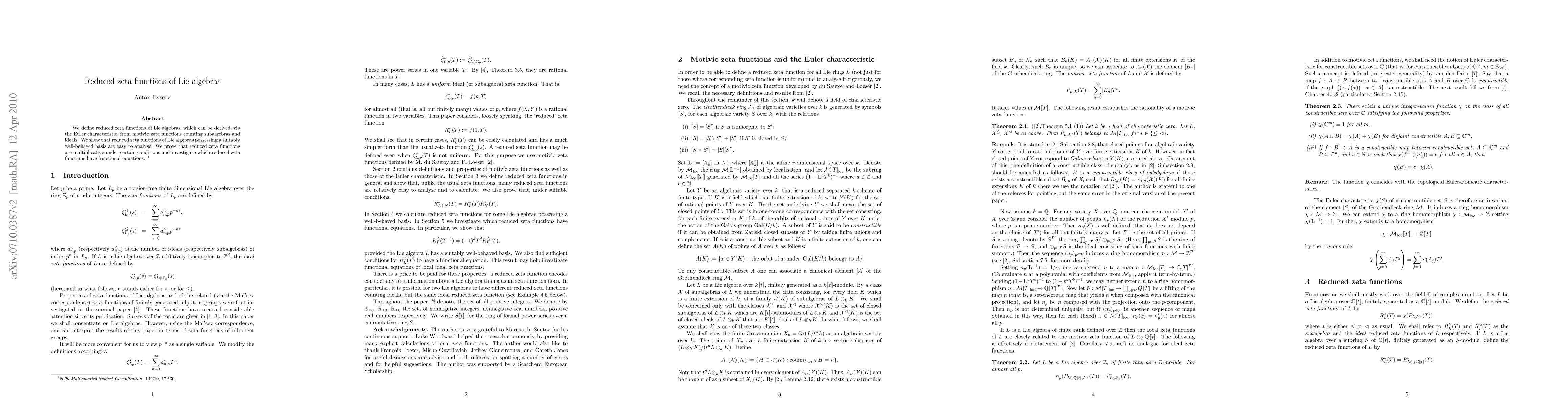 This paper introduces reduced zeta functions of Lie algebras derived from motivic zeta functions via the Euler characteristic, demonstrating their simplicity for well-behaved bases. The authors prove multiplicativity under specific conditions and explore the presence of functional equations in these reduced zeta functions.