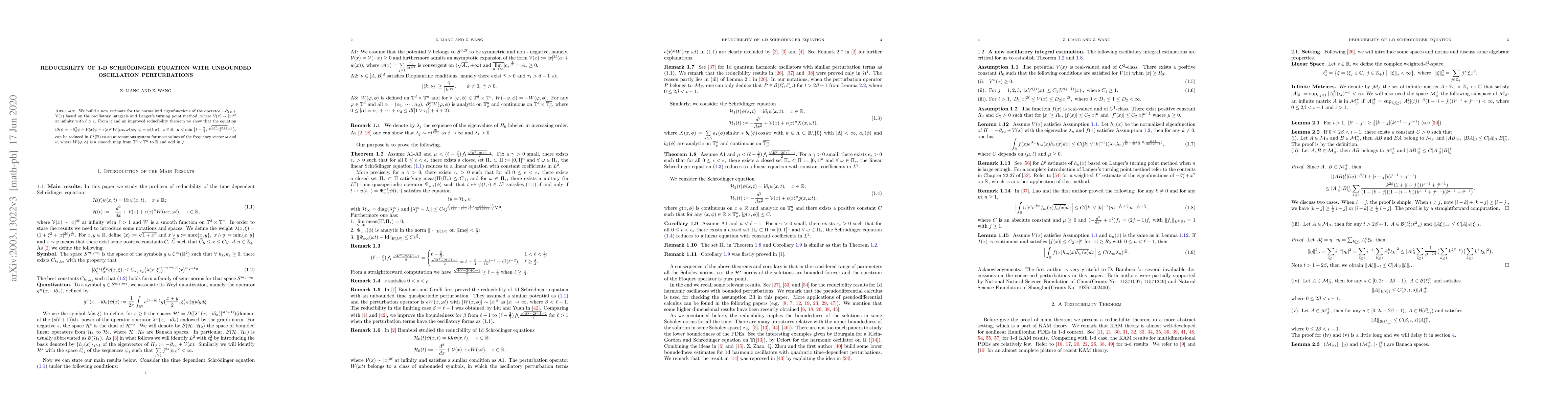 We build a new estimate for the normalized eigenfunctions of the operator $-\partial_{xx}+\mathcal V(x)$ based on the oscillatory integrals and Langer's turning point method, where $\mathcal V(x)\sim |x|^{2\ell}$ at infinity with $\ell>1$. From it and an improved reducibility theorem we show that the equation \[\textstyle {\rm i}\partial_t \psi =-\partial_x^2 \psi+\mathcal V(x) \psi+\epsilon \langle x\rangle^{\mu} W(\nu x,\omega t)\psi,\quad \psi=\psi(t,x),~x\in\mathbb R, ~\mu<\min\left\{\ell-\frac23,\frac{\sqrt{4\ell^2-2\ell+1}-1}2\right\},\] can be reduced in $L^2(\mathbb R)$ to an autonomous system for most values of the frequency vector $\omega$ and $\nu$, where $W(\varphi, \phi)$ is a smooth map from $ \mathbb T^d\times \mathbb T^n$ to $\mathbb R$ and odd in $\varphi$.