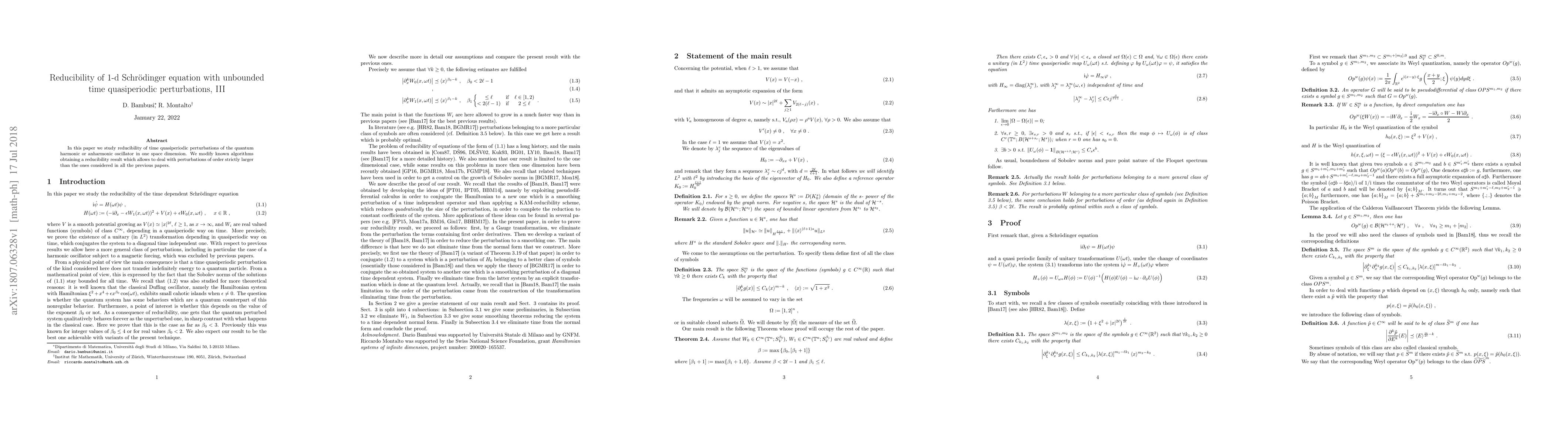 This paper investigates the reducibility of the 1-d Schrödinger equation with quasiperiodic perturbations in time, extending previous work to handle higher-order perturbations. The authors refine existing algorithms to achieve this reducibility for time quasiperiodic perturbations of quantum harmonic or anharmonic oscillators.