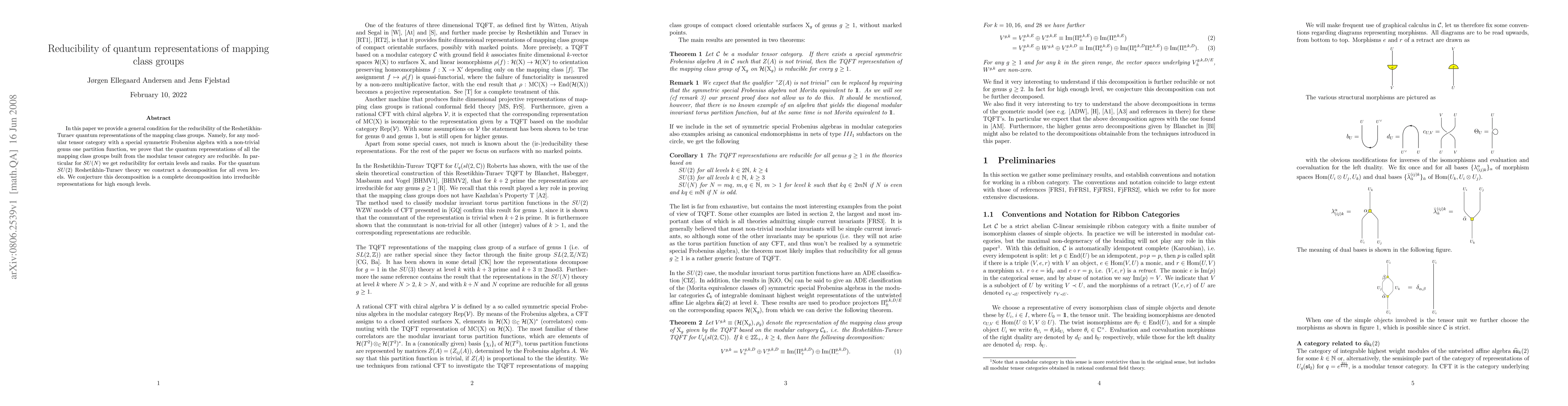 This paper establishes conditions for the reducibility of Reshetikhin-Turaev quantum representations of mapping class groups, showing that representations derived from modular tensor categories with specific symmetric Frobenius algebras are reducible, especially for SU(N) at certain levels and ranks, and providing a complete decomposition conjecture for high-level quantum SU(2) representations.