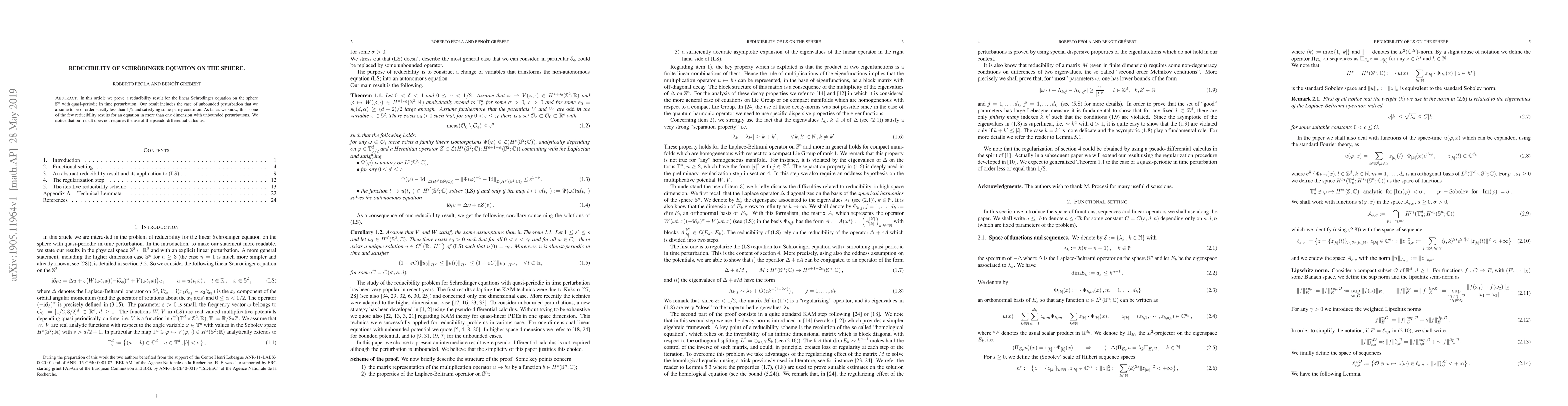 This paper proves a reducibility result for the linear Schrödinger equation on the sphere with quasi-periodic time perturbations, including unbounded perturbations of order less than 1/2 under a parity condition. Notably, this result extends to higher dimensions without relying on pseudo-differential calculus.