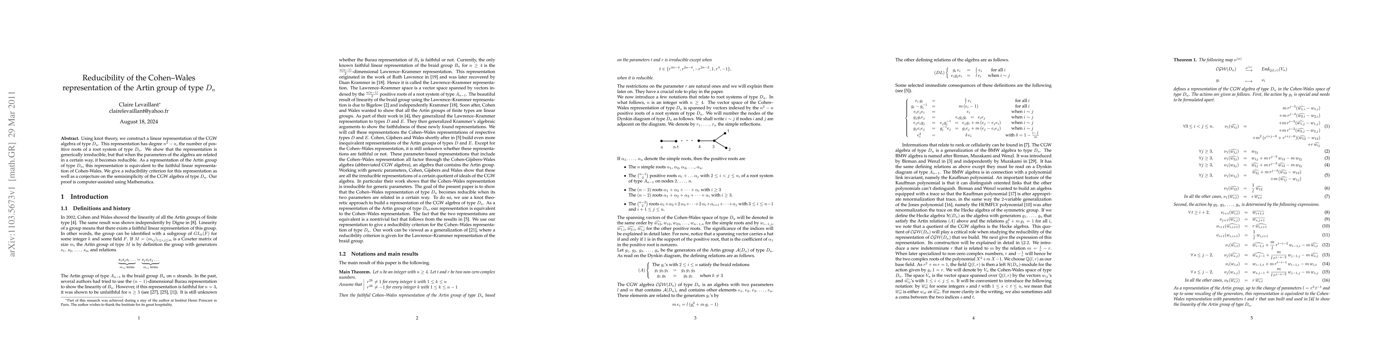 Using knot theory, we construct a linear representation of the CGW algebra of type $D_n$. This representation has degree $n^2-n$, the number of positive roots of a root system of type $D_n$. We show that the representation is generically irreducible, but that when the parameters of the algebra are related in a certain way, it becomes reducible. As a representation of the Artin group of type $D_n$, this representation is equivalent to the faithful linear representation of Cohen-Wales. We give a reducibility criterion for this representation as well as a conjecture on the semisimplicity of the CGW algebra of type $D_n$. Our proof is computer-assisted using Mathematica.