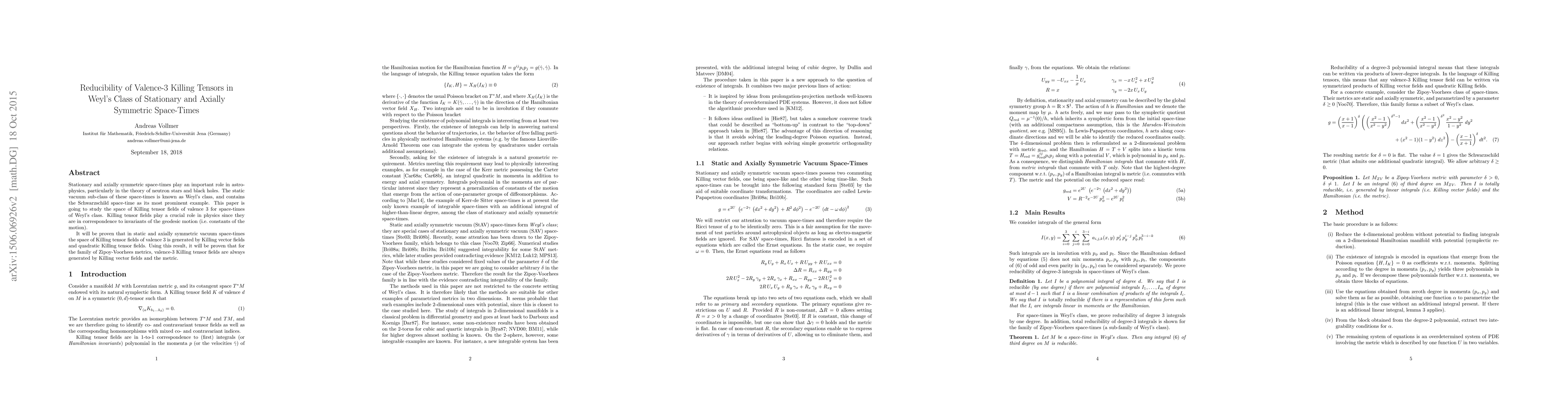 This paper investigates the reducibility of valence-3 Killing tensor fields in Weyl's class of stationary and axially symmetric space-times, proving they are generated by Killing vector fields and quadratic Killing tensor fields. It further demonstrates this for the family of Zipoy-Voorhees metrics.