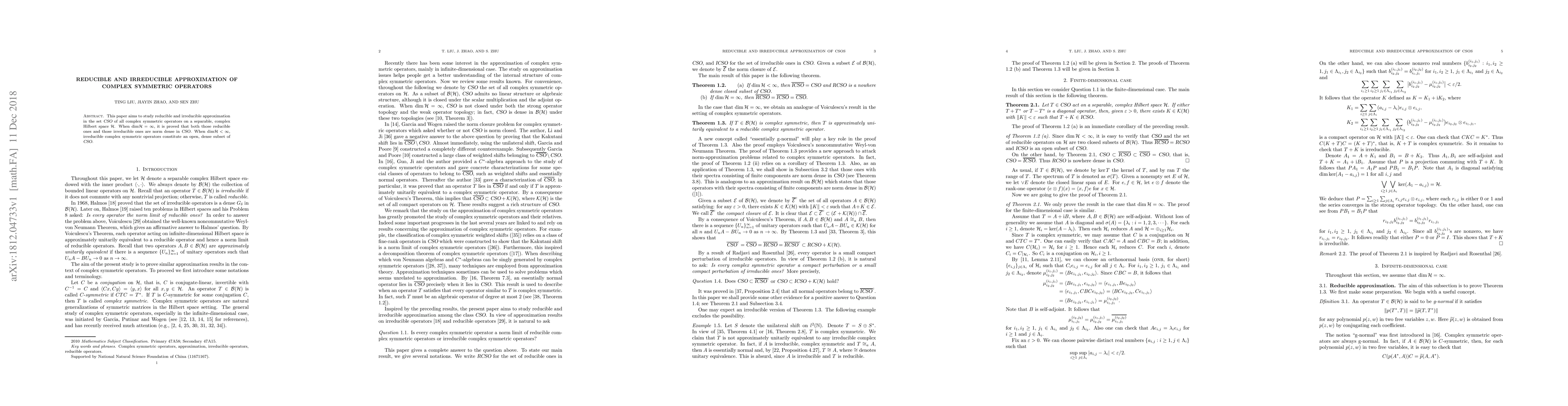 This paper aims to study reducible and irreducible approximation in the set $\textsl{CSO}$ of all complex symmetric operators on a separable, complex Hilbert space $\mathcal H$. When ${\rm dim} \mathcal H=\infty$, it is proved that both those reducible ones and those irreducible ones are norm dense in $\textsl{CSO}$. When ${\rm dim} \mathcal H<\infty$, irreducible complex symmetric operators constitute an open, dense subset of $\textsl{CSO}$.
