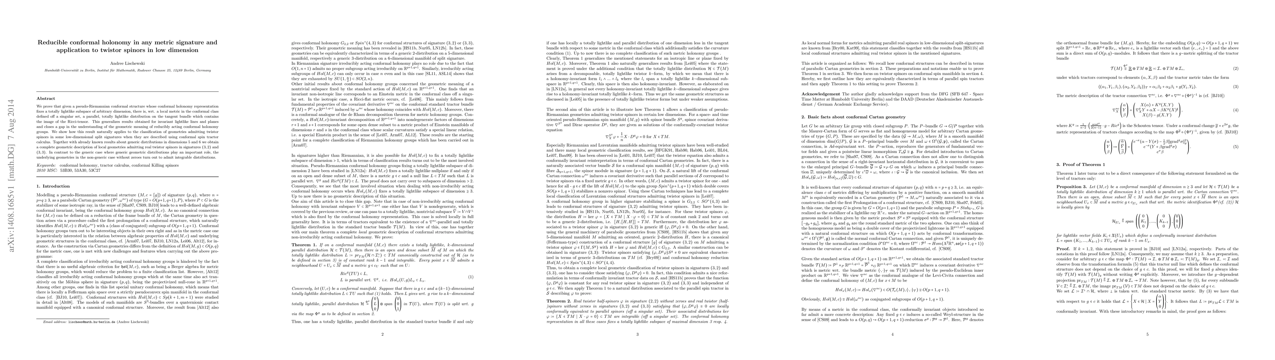 This paper proves the existence of a parallel, totally lightlike distribution in pseudo-Riemannian conformal structures with reducibly acting holonomy, filling a gap in the understanding of such holonomy groups. It also applies this result to classify geometries admitting twistor spinors in low-dimensional split signatures, providing a complete geometric description for signatures (3,2) and (3,3).