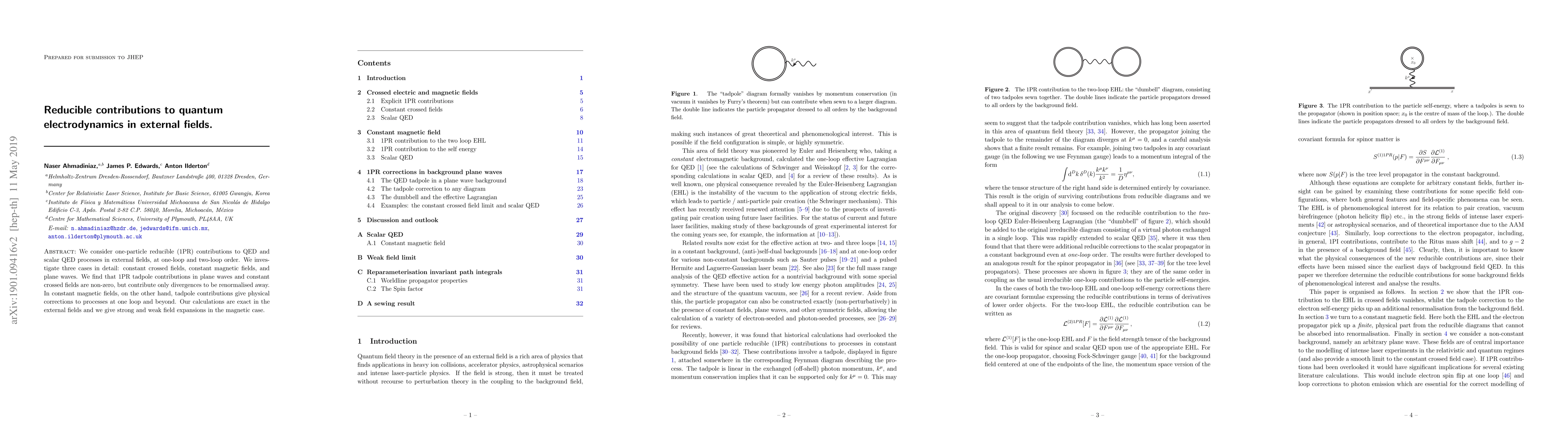 We consider one-particle reducible (1PR) contributions to QED and scalar QED processes in external fields, at one-loop and two-loop order. We investigate three cases in detail: constant crossed fields, constant magnetic fields, and plane waves. We find that 1PR tadpole contributions in plane waves and constant crossed fields are non-zero, but contribute only divergences to be renormalised away. In constant magnetic fields, on the other hand, tadpole contributions give physical corrections to processes at one-loop and beyond. Our calculations are exact in the external fields and we give strong and weak field expansions in the magnetic case.