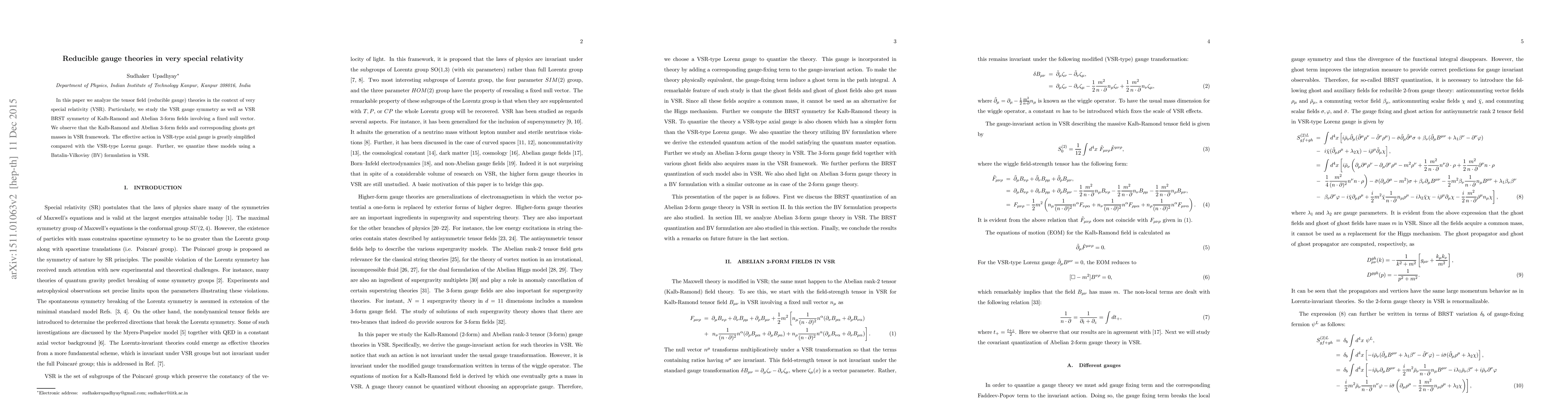 In this paper we analyze the tensor field (reducible gauge) theories in the context of very special relativity (VSR). Particularly, we study the VSR gauge symmetry as well as VSR BRST symmetry of Kalb-Ramond and Abelian 3-form fields involving a fixed null vector. We observe that the Kalb-Ramond and Abelian 3-form fields and corresponding ghosts get masses in VSR framework. The effective action in VSR-type axial gauge is greatly simplified compared with the VSR-type Lorenz gauge. Further, we quantize these models using a Batalin-Vilkovisy (BV) formulation in VSR.