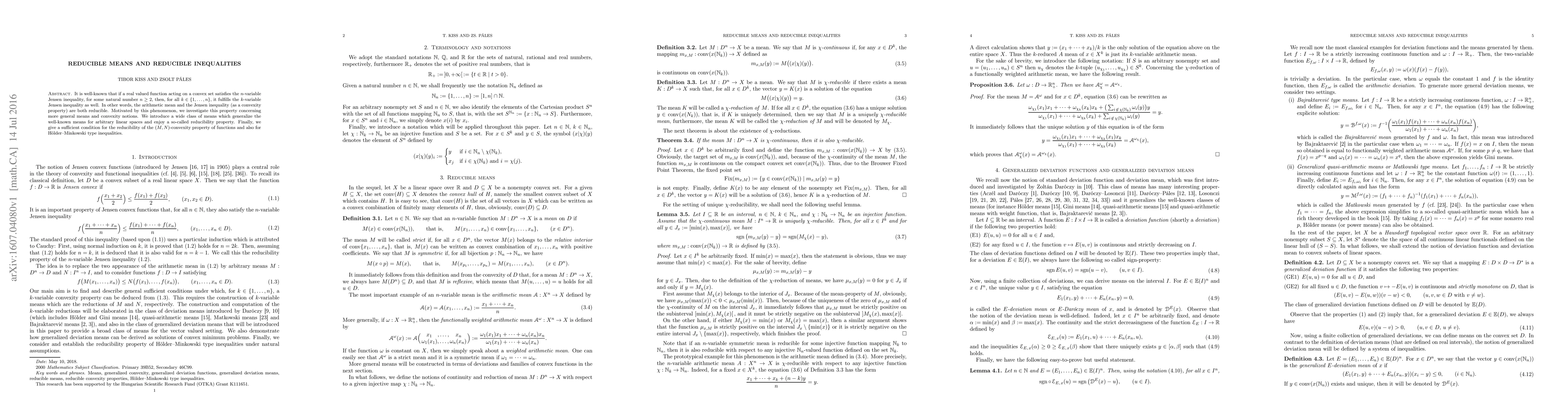 It is well-known that if a real valued function acting on a convex set satisfies the $n$-variable Jensen inequality, for some natural number $n\geq 2$, then, for all $k\in\{1,\dots, n\}$, it fulfills the $k$-variable Jensen inequality as well. In other words, the arithmetic mean and the Jensen inequality (as a convexity property) are both reducible. Motivated by this phenomenon, we investigate this property concerning more general means and convexity notions. We introduce a wide class of means which generalize the well-known means for arbitrary linear spaces and enjoy a so-called reducibility property. Finally, we give a sufficient condition for the reducibility of the $(M,N)$-convexity property of functions and also for H\"older--Minkowski type inequalities.