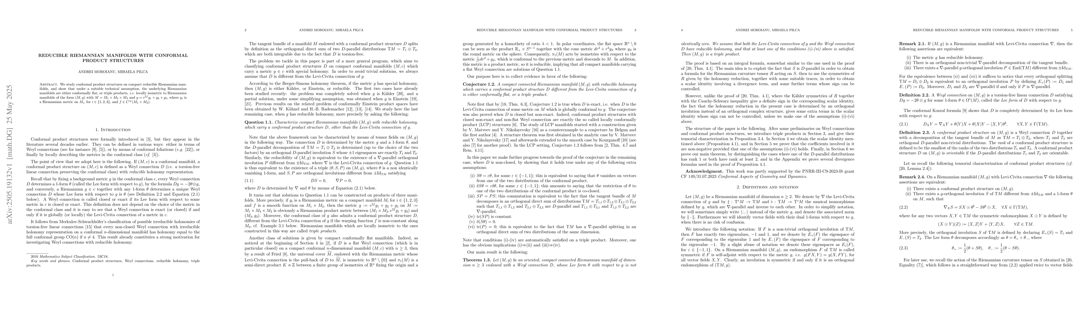 The paper investigates conformal product structures on compact reducible Riemannian manifolds, employing technical assumptions to classify the underlying manifolds.
