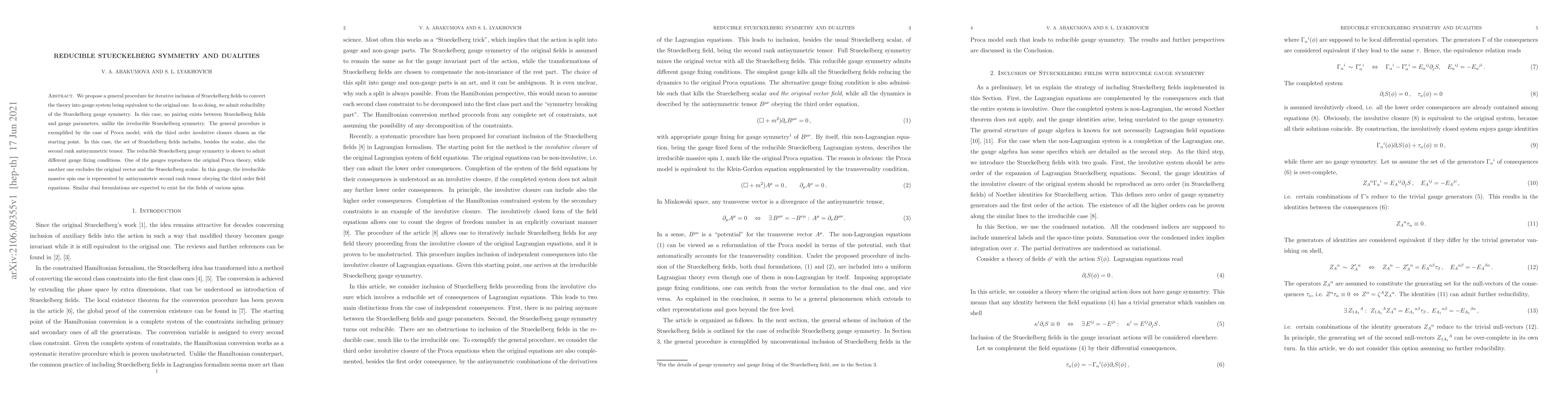 This paper proposes a method to iteratively incorporate Stueckelberg fields to convert a theory into an equivalent gauge system, allowing for the reducibility of Stueckelberg gauge symmetry. It demonstrates this procedure using the Proca model, showing different gauge fixing conditions that lead to distinct formulations, including a dual representation of massive spin-one fields as antisymmetric tensors.