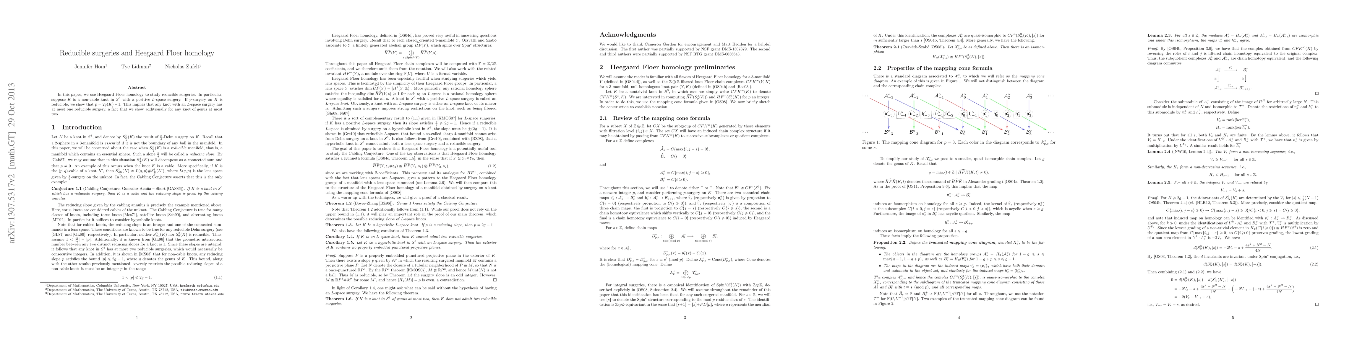In this paper, we use Heegaard Floer homology to study reducible surgeries. In particular, suppose K is a non-cable knot in the three-sphere with an L-space surgery. If p-surgery on K is reducible, we show that p equals 2g(K)-1. This implies that any knot with an L-space surgery has at most one reducible surgery, a fact that we show additionally for any knot of genus at most two.