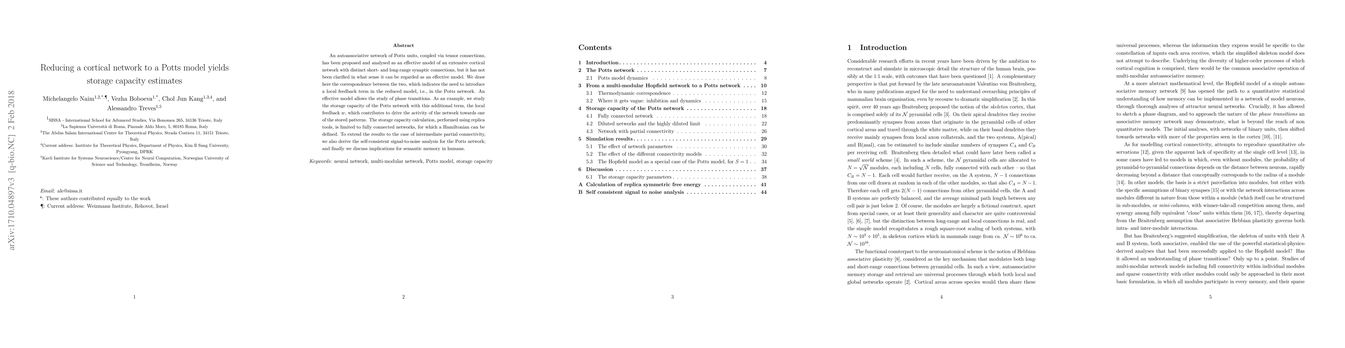 Researchers used a Potts model to study the storage capacity of a cortical network, finding that adding local feedback improves its effectiveness in modeling human memory; they also derived a self-consistent signal-to-noise analysis for partial connectivity.