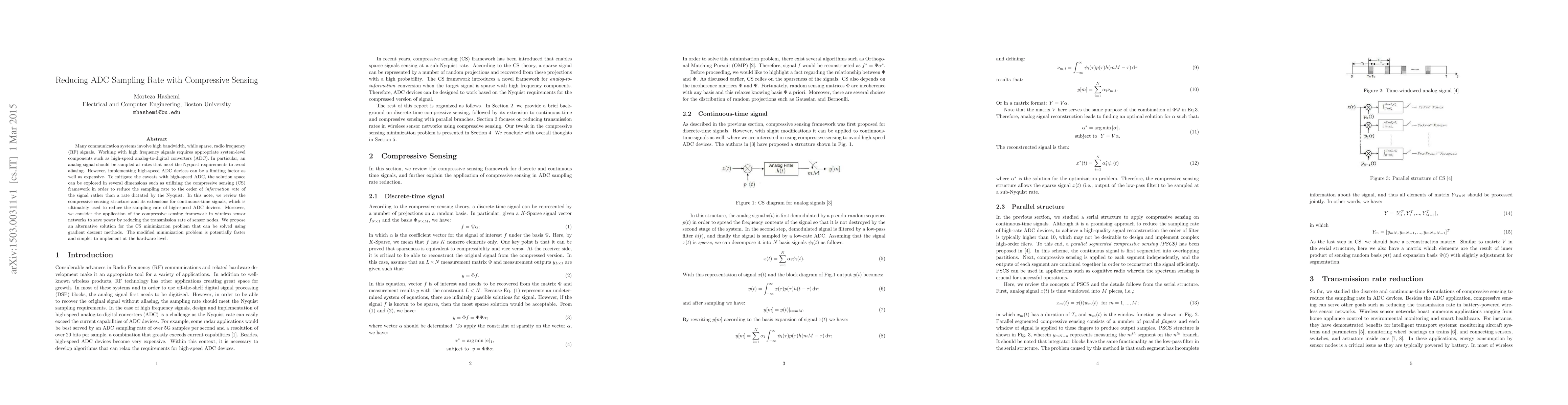 Many communication systems involve high bandwidth, while sparse, radio frequency (RF) signals. Working with high frequency signals requires appropriate system-level components such as high-speed analog-to-digital converters (ADC). In particular, an analog signal should be sampled at rates that meet the Nyquist requirements to avoid aliasing. However, implementing high-speed ADC devices can be a limiting factor as well as expensive. To mitigate the caveats with high-speed ADC, the solution space can be explored in several dimensions such as utilizing the compressive sensing (CS) framework in order to reduce the sampling rate to the order of information rate of the signal rather than a rate dictated by the Nyquist. In this note, we review the compressive sensing structure and its extensions for continuous-time signals, which is ultimately used to reduce the sampling rate of high-speed ADC devices. Moreover, we consider the application of the compressive sensing framework in wireless sensor networks to save power by reducing the transmission rate of sensor nodes. We propose an alternative solution for the CS minimization problem that can be solved using gradient descent methods. The modified minimization problem is potentially faster and simpler to implement at the hardware level.