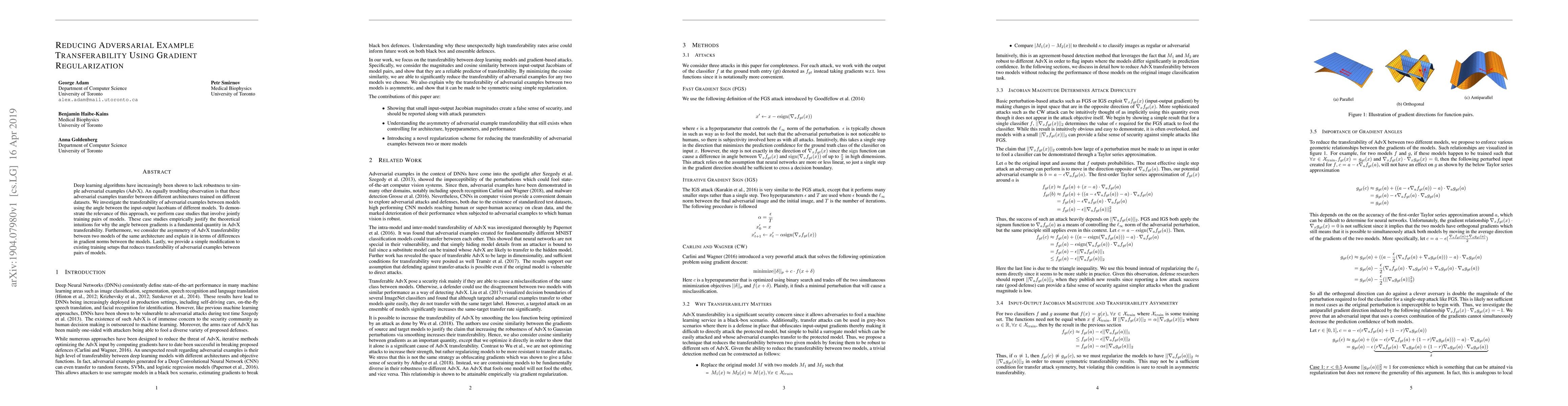 This paper explores the transferability of adversarial examples between different deep learning models and proposes gradient regularization as a method to reduce this transferability. The authors demonstrate that the angle between input-output Jacobians is a key factor in adversarial example transfer and suggest a training modification to mitigate it.
