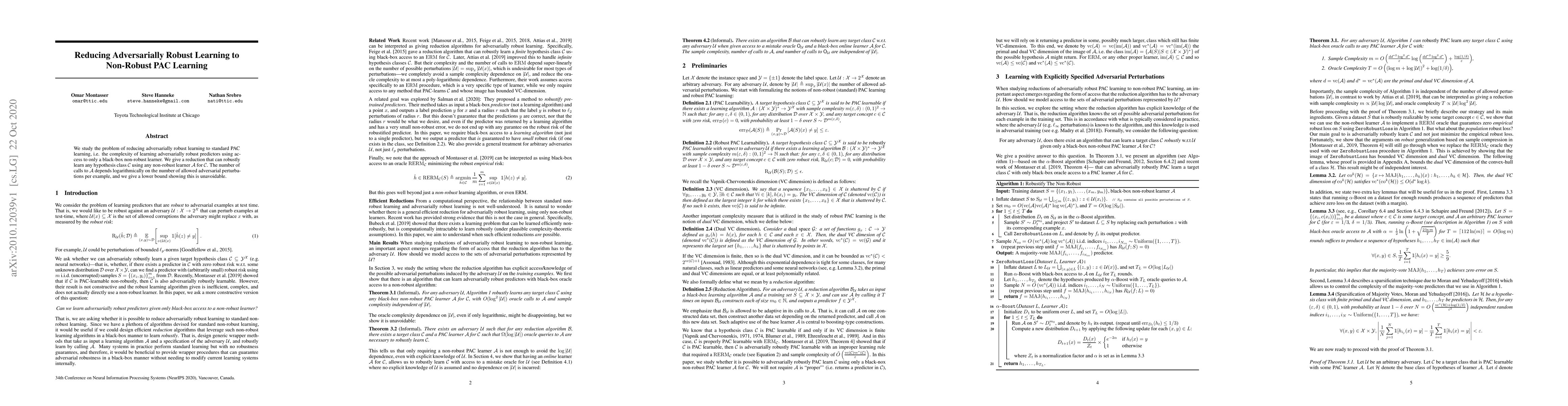 This paper presents a method to reduce adversarially robust learning to standard PAC learning, demonstrating that any non-robust learner can be used to robustly learn any hypothesis class $\mathcal{C}$ with logarithmically dependent calls, and provides a lower bound proving the necessity of this complexity.
