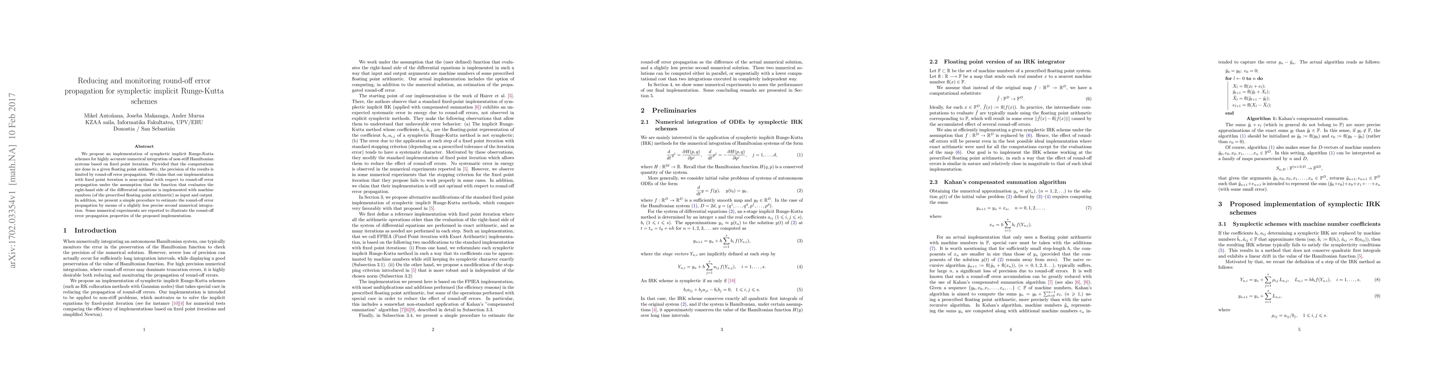 This paper proposes a symplectic implicit Runge-Kutta scheme with fixed point iteration for accurate numerical integration of Hamiltonian systems, claiming near-optimality in minimizing round-off error. It also introduces a method to estimate round-off error through a secondary, less precise integration, supported by numerical experiments.