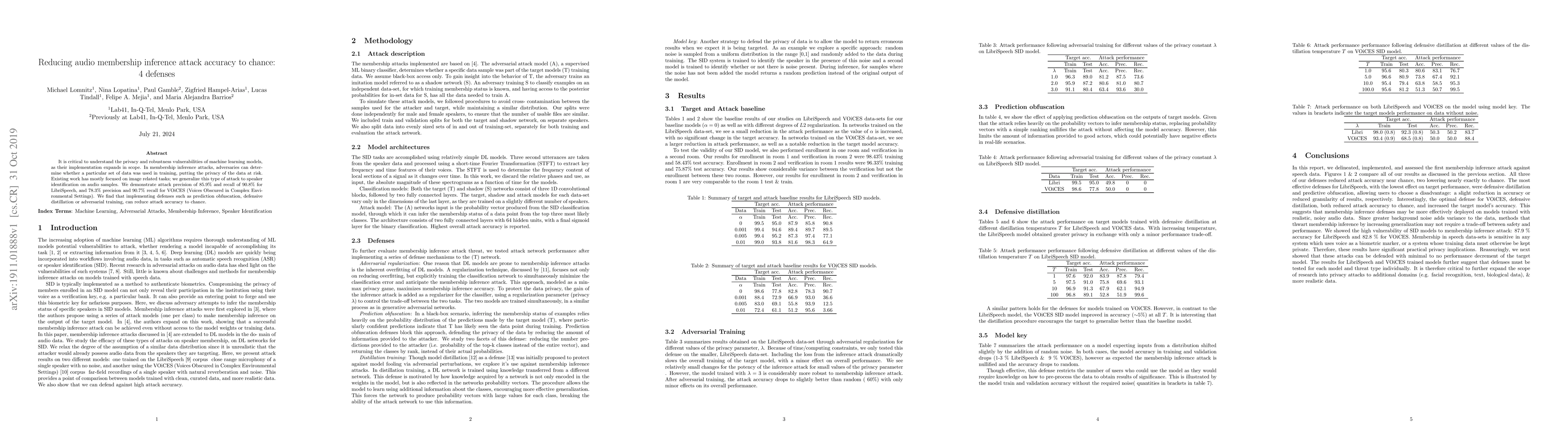 This research identifies a significant privacy risk in audio-based machine learning models, where attackers can determine training data through membership inference attacks. Achieving high accuracy (85.9% precision, 90.8% recall on LibriSpeech; 78.3% precision, 90.7% recall on VOiCES), the study then demonstrates that defenses like prediction obfuscation, defensive distillation, and adversarial training can effectively reduce attack accuracy to chance, enhancing model privacy and robustness.