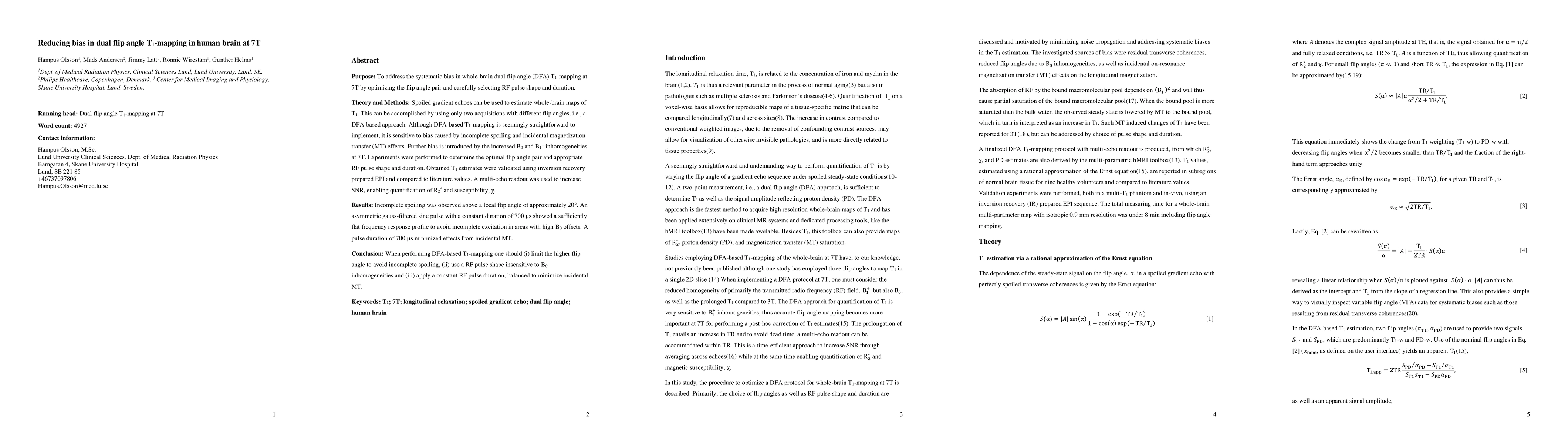 A study optimizes flip angle pairs and RF pulse shapes to reduce bias in dual flip angle T1-mapping at 7T magnetic field strength, improving accuracy of brain tissue characterization.