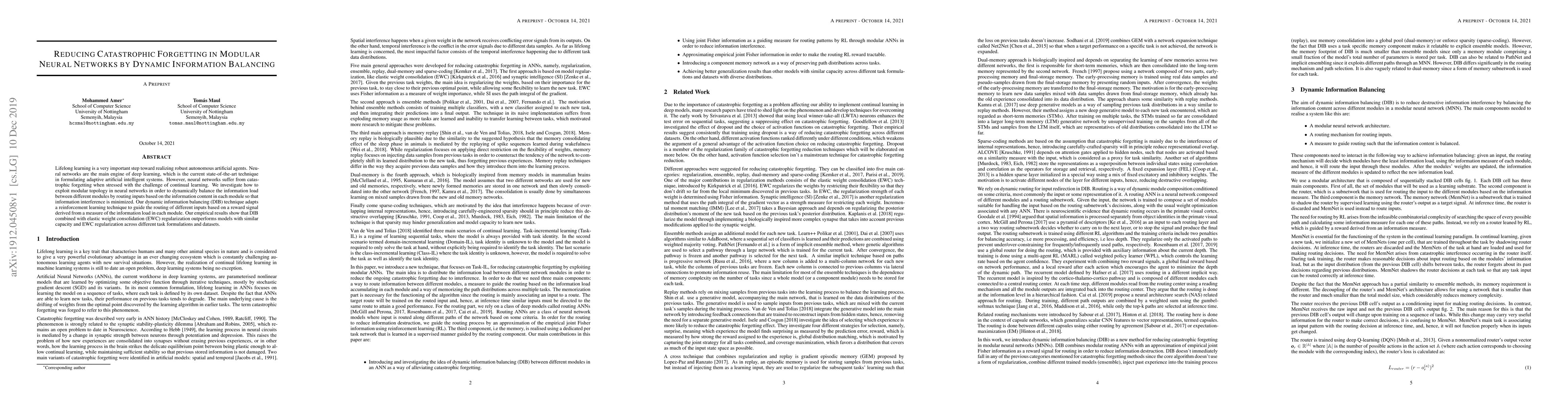 This paper proposes a dynamic information balancing (DIB) technique to reduce catastrophic forgetting in modular neural networks by routing inputs based on module information content, guided by reinforcement learning. Empirical results show that DIB combined with elastic weight consolidation (EWC) outperforms EWC alone in continual learning scenarios.