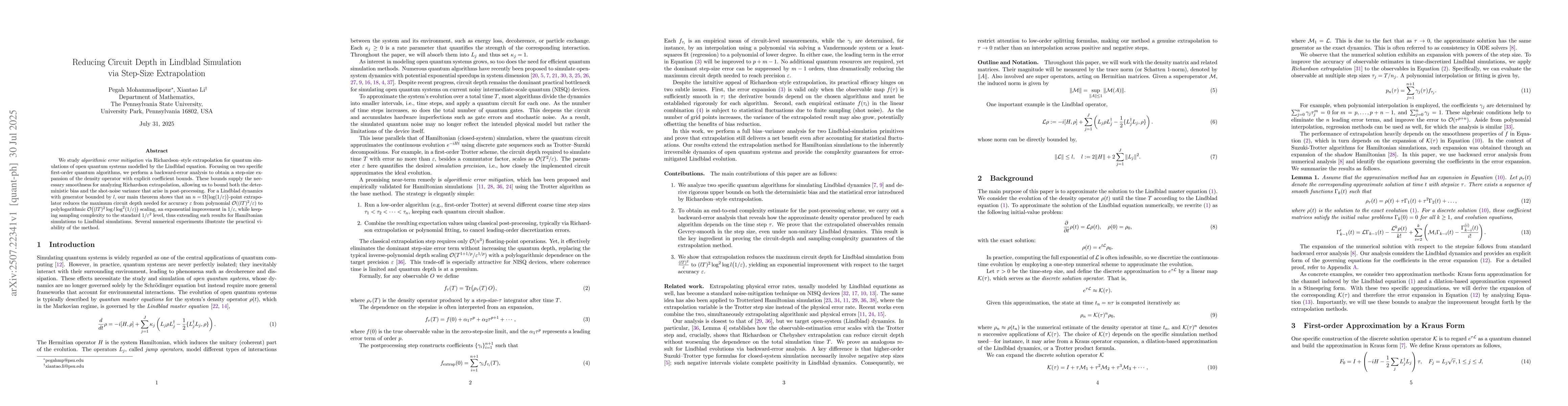 The paper presents a backward-error analysis for first-order quantum algorithms simulating Lindblad dynamics, deriving a step-size expansion with explicit coefficient bounds and proving that an n=Ω(log(1/ε))-point extrapolator reduces circuit depth from polynomial to polylogarithmic scaling.