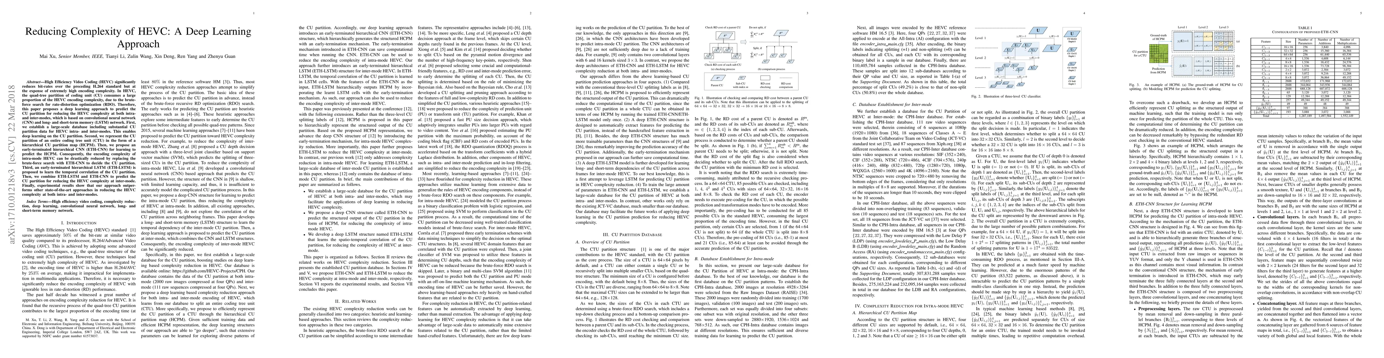 This paper proposes a deep learning approach to reduce complexity in High Efficiency Video Coding (HEVC) by predicting coding unit partitions using convolutional neural networks and long/short-term memory networks.