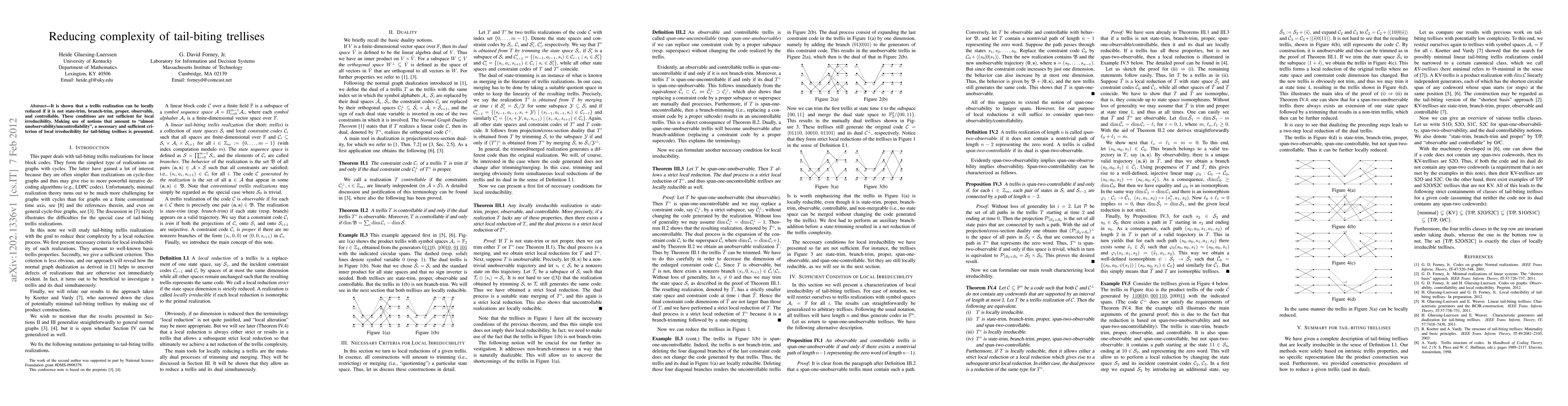 This paper presents a necessary and sufficient criterion for local irreducibility of tail-biting trellises, showing that such reduction is possible when the trellis fails to meet specific state-trim, branch-trim, proper, observable, and controllable conditions, introducing the concept of "almost unobservability/uncontrollability" for this purpose.