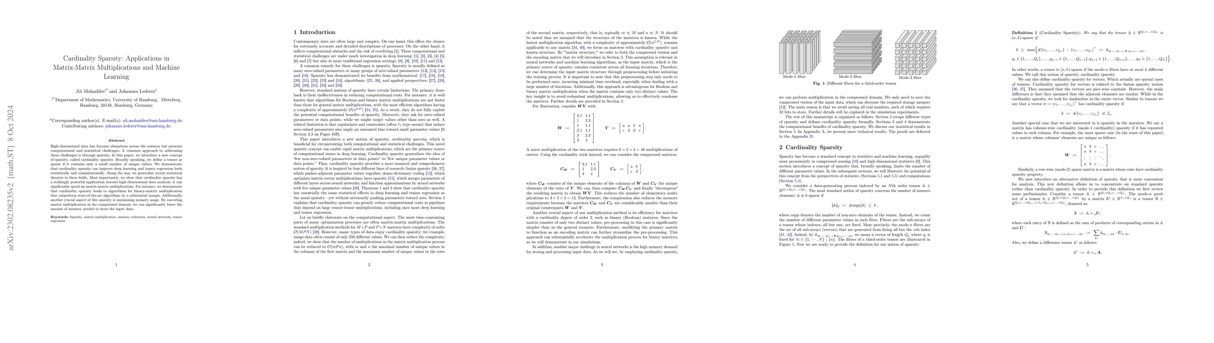 This paper introduces cardinality sparsity as a novel approach to tackle computational and statistical challenges in high-dimensional data. It demonstrates that tensors with a small number of unique values can enhance both deep learning and tensor regression, improving both statistical efficiency and computational efficiency.