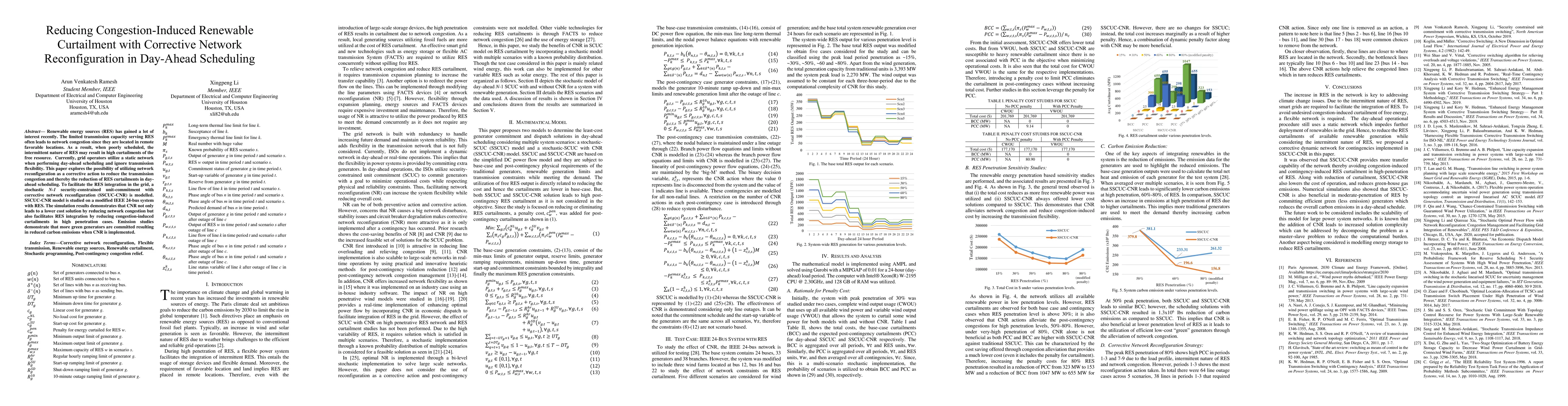 This paper proposes a stochastic model for day-ahead scheduling that incorporates corrective network reconfiguration to reduce congestion-induced curtailment of renewable energy sources. Simulation results show that this approach lowers costs, enhances renewable energy integration, and reduces carbon emissions.