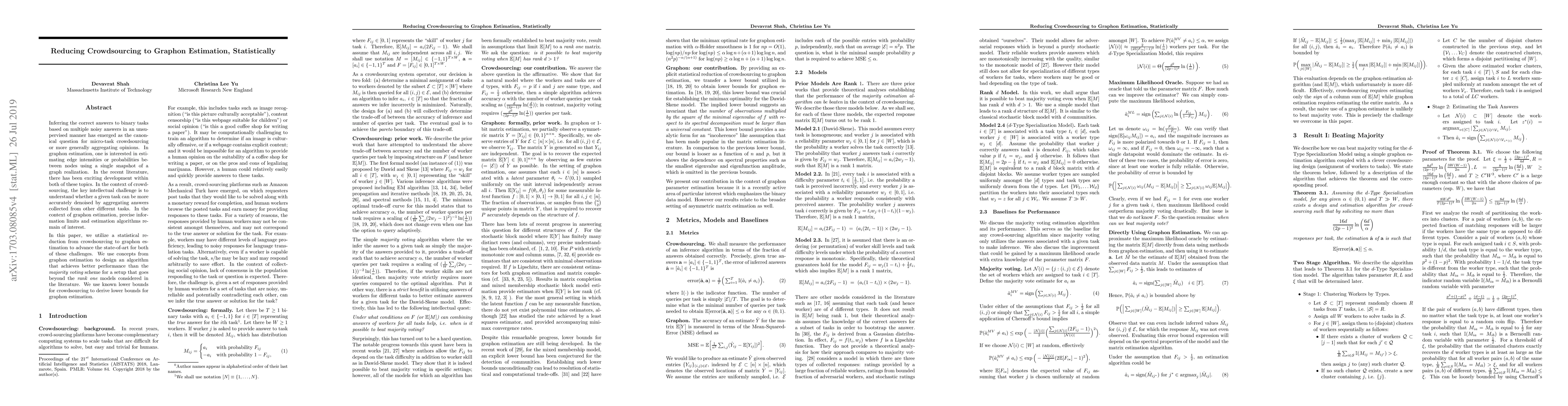 This paper proposes a statistical reduction from crowdsourcing to graphon estimation to enhance both fields. It designs an advanced algorithm that outperforms majority voting in de-noising binary task answers, extending beyond rank one models.