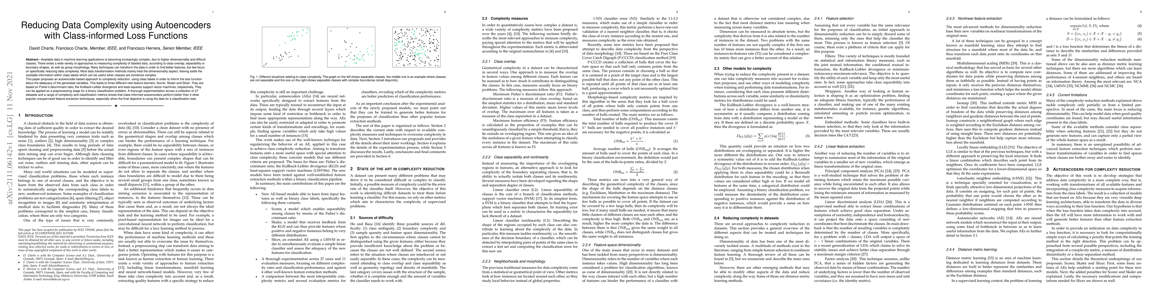 Available data in machine learning applications is becoming increasingly complex, due to higher dimensionality and difficult classes. There exists a wide variety of approaches to measuring complexity of labeled data, according to class overlap, separability or boundary shapes, as well as group morphology. Many techniques can transform the data in order to find better features, but few focus on specifically reducing data complexity. Most data transformation methods mainly treat the dimensionality aspect, leaving aside the available information within class labels which can be useful when classes are somehow complex. This paper proposes an autoencoder-based approach to complexity reduction, using class labels in order to inform the loss function about the adequacy of the generated variables. This leads to three different new feature learners, Scorer, Skaler and Slicer. They are based on Fisher's discriminant ratio, the Kullback-Leibler divergence and least-squares support vector machines, respectively. They can be applied as a preprocessing stage for a binary classification problem. A thorough experimentation across a collection of 27 datasets and a range of complexity and classification metrics shows that class-informed autoencoders perform better than 4 other popular unsupervised feature extraction techniques, especially when the final objective is using the data for a classification task.