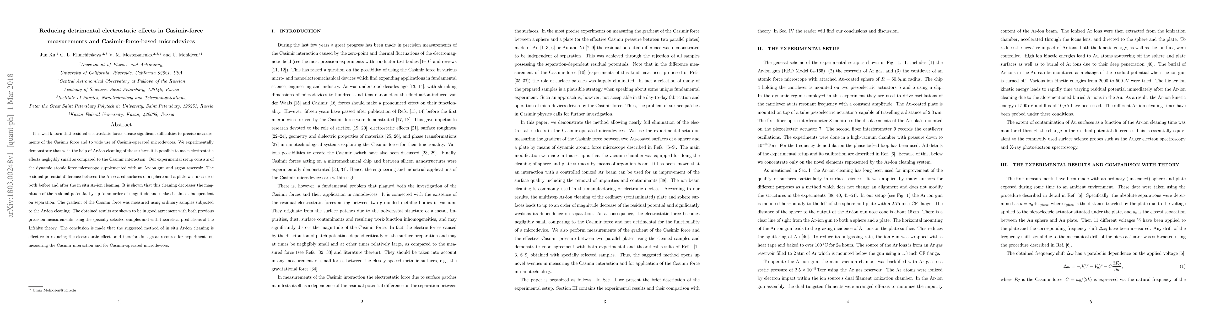 This paper demonstrates that Ar-ion cleaning significantly reduces residual electrostatic forces, improving the precision of Casimir force measurements and the functionality of Casimir-operated microdevices. Experimental results show a tenfold decrease in residual potential and agreement with theoretical predictions, validating the effectiveness of in situ Ar-ion cleaning.
