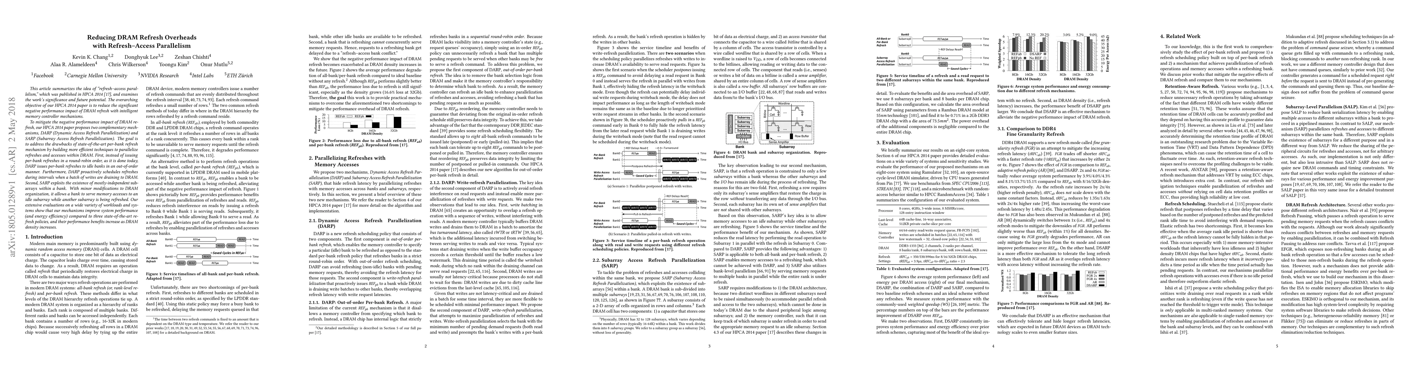 This paper proposes DARP and SARP mechanisms to reduce DRAM refresh overheads by parallelizing refresh operations with memory accesses, thereby improving performance and energy efficiency. Evaluations show significant benefits over existing refresh policies, especially in high-density DRAM environments.