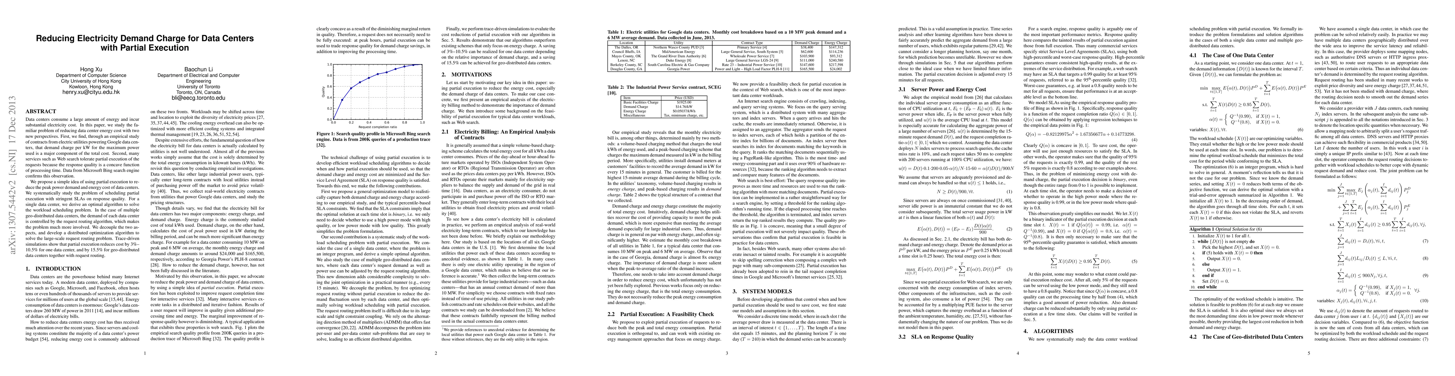 This paper proposes using partial execution to reduce peak power demand and energy costs in data centers, finding that demand charge per kW is a significant cost component. It introduces an optimal scheduling algorithm for single data centers and a distributed optimization algorithm for geo-distributed centers, achieving cost reductions of $3\%--10.5\%$ and $15.5\%$ respectively.