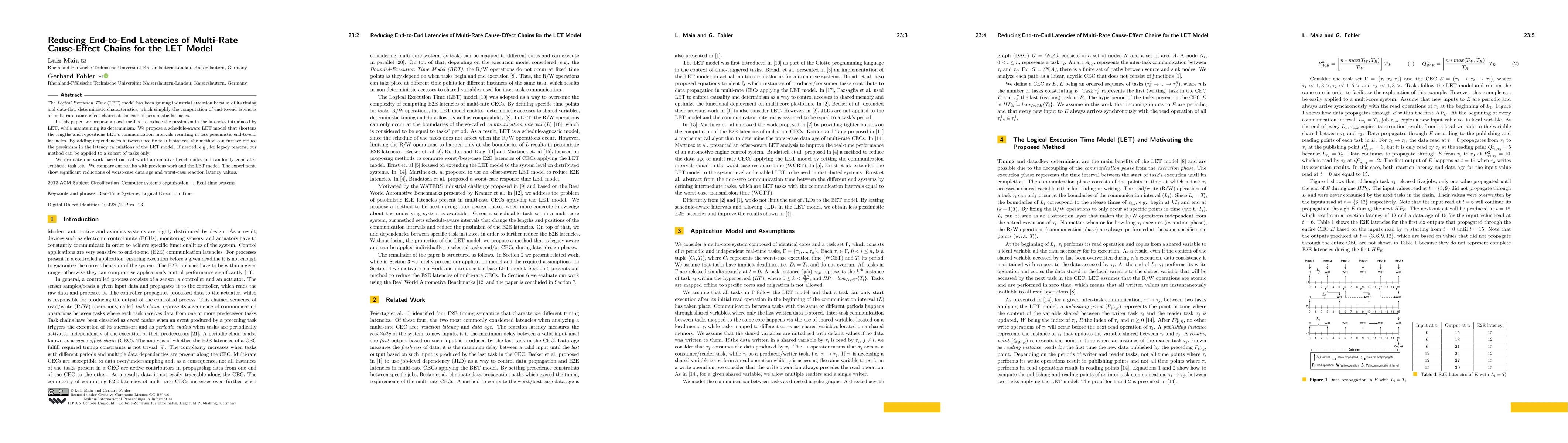 The Logical Execution Time (LET) model has deterministic timing and data-flow properties, which simplify the computation of end-to-end latencies of multi-rate cause-effect chains. However, the LET model results in pessimistic end-to-end latencies since it abstracts the underlying platform and scheduling choices. In this paper, we propose a method to reduce end-to-end latencies of multi-rate cause-effect chains applying the LET model, by considering knowledge of the schedule in later design phases of safety critical embedded systems. Our method shortens and shifts the communication intervals of the LET model. If needed, e.g., for legacy reasons, our method can be applied to a subset of tasks only. We evaluate our work based on automotive benchmarks and synthetic task sets. We compare our results with previous work and the LET model. The experiments show significant reductions of maximum reaction time and data age values.