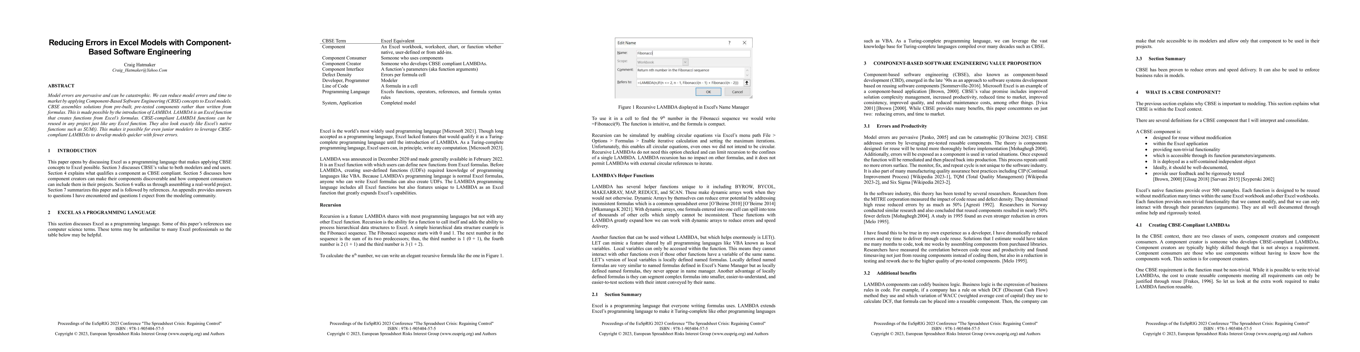 Model errors are pervasive and can be catastrophic. We can reduce model errors and time to market by applying Component-Based Software Engineering (CBSE) concepts to Excel models. CBSE assembles solutions from pre-built, pre-tested components rather than written from formulas. This is made possible by the introduction of LAMBDA. LAMBDA is an Excel function that creates functions from Excel's formulas. CBSE-compliant LAMBDA functions can be reused in any project just like any Excel function. They also look exactly like Excel's native functions such as SUM(). This makes it possible for even junior modelers to leverage CBSE-compliant LAMBDAs to develop models quicker with fewer errors.