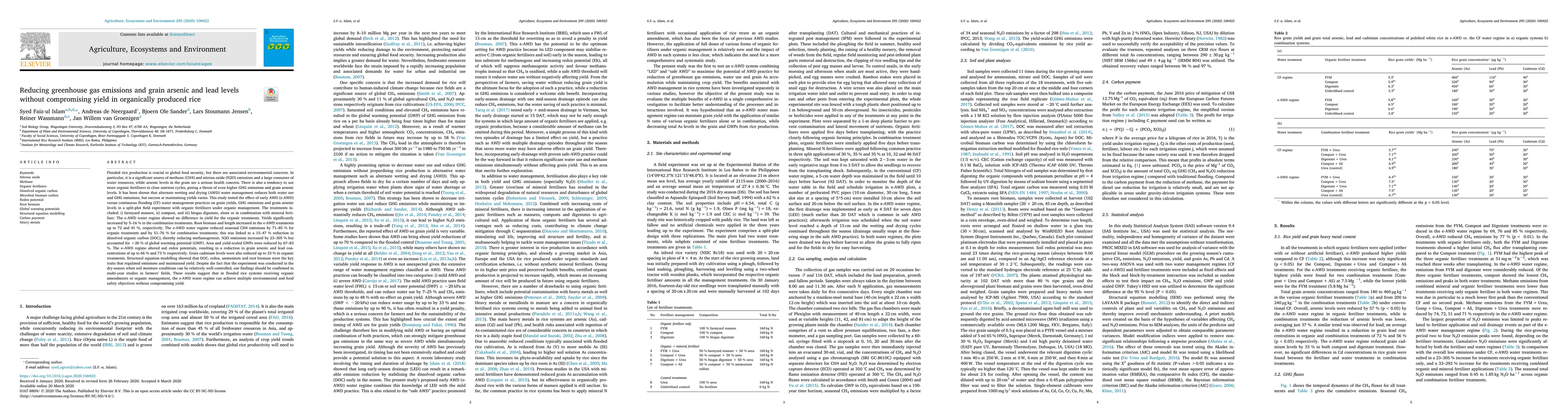 This study investigates the impact of alternate wetting and drying (e-AWD) versus continuous flooding (CF) on organic rice production, finding that e-AWD maintains yields while reducing methane emissions by 71-85% and lowering arsenic and lead levels in grain by up to 66% and 73%, respectively.