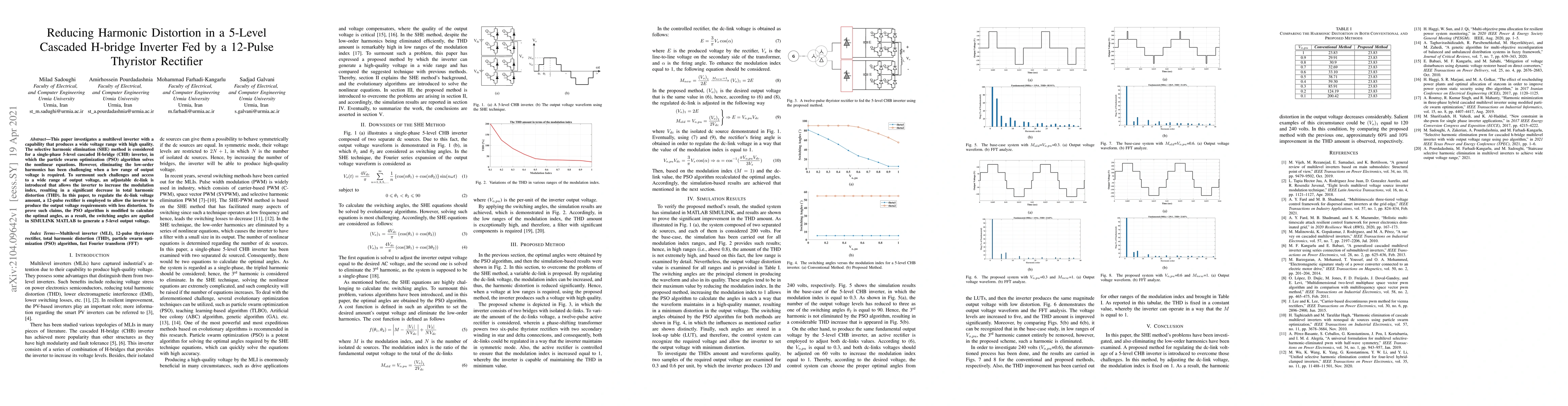 This paper explores a 5-level cascaded H-bridge inverter with a 12-pulse thyristor rectifier, utilizing selective harmonic elimination and particle swarm optimization to minimize total harmonic distortion. An adjustable dc-link and modulation index increase enable the inverter to achieve a wide voltage range with reduced harmonic distortion.
