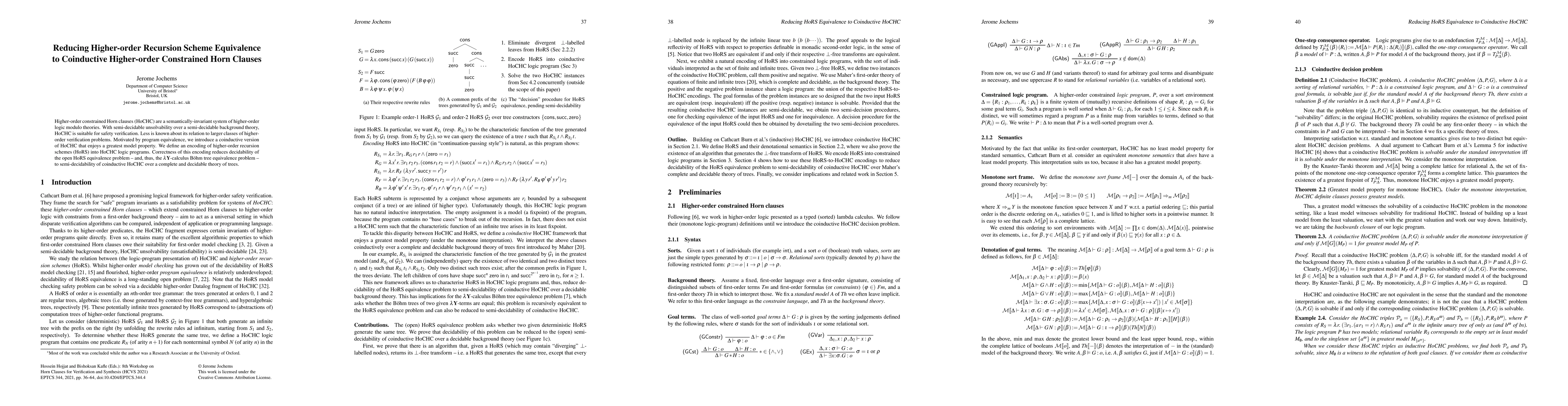 Higher-order constrained Horn clauses (HoCHC) are a semantically-invariant system of higher-order logic modulo theories. With semi-decidable unsolvability over a semi-decidable background theory, HoCHC is suitable for safety verification. Less is known about its relation to larger classes of higher-order verification problems. Motivated by program equivalence, we introduce a coinductive version of HoCHC that enjoys a greatest model property. We define an encoding of higher-order recursion schemes (HoRS) into HoCHC logic programs. Correctness of this encoding reduces decidability of the open HoRS equivalence problem -- and, thus, the LambdaY-calculus B\"ohm tree equivalence problem -- to semi-decidability of coinductive HoCHC over a complete and decidable theory of trees.
