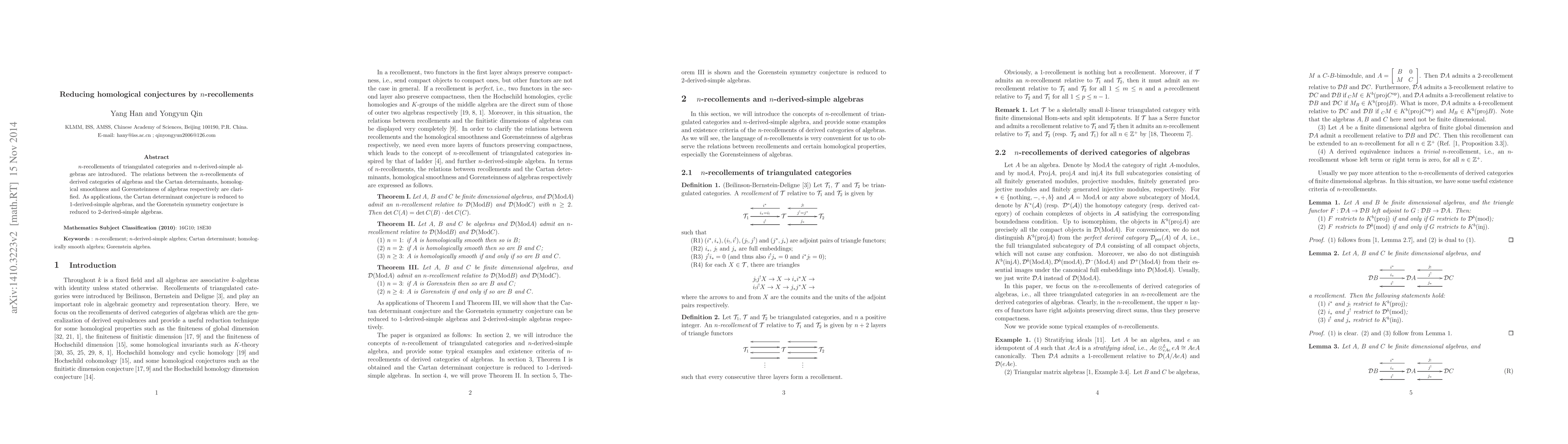 This paper introduces n-recollements of triangulated categories and n-derived-simple algebras, elucidating their connections to Cartan determinants, homological smoothness, and Gorensteinness. It applies these concepts to reduce the Cartan determinant conjecture to 1-derived-simple algebras and the Gorenstein symmetry conjecture to 2-derived-simple algebras.
