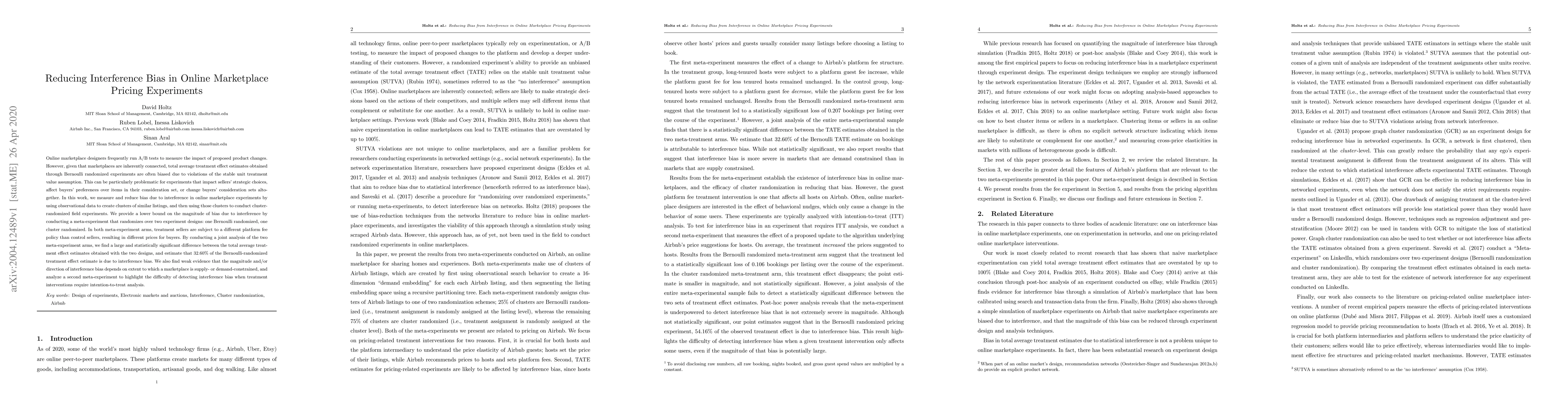This research measures and mitigates interference bias in online marketplace pricing experiments by comparing Bernoulli randomized and cluster-randomized field experiments. Results show a significant difference, with 32.60% of the Bernoulli estimate attributable to interference bias, indicating the effectiveness of cluster randomization in reducing bias.