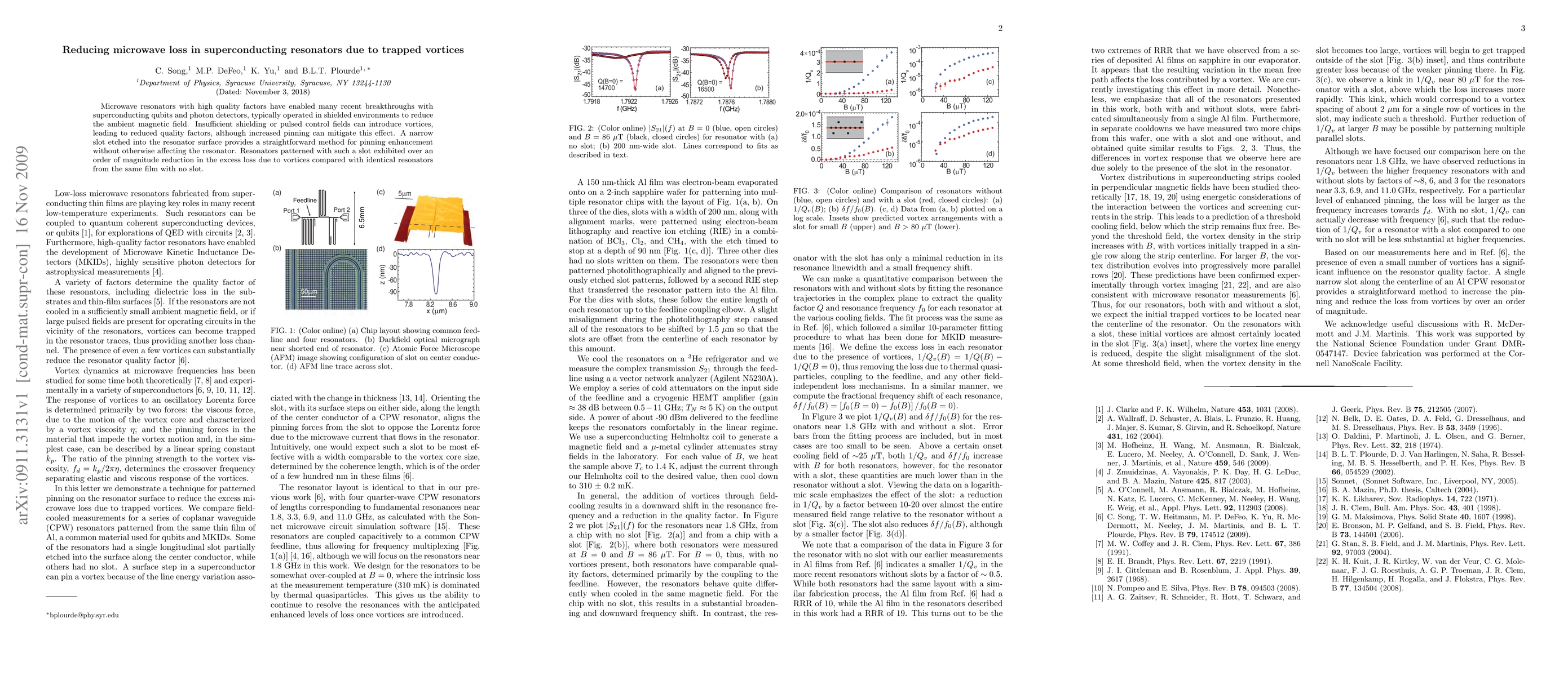 This study demonstrates a method to significantly reduce microwave loss in superconducting resonators by introducing a narrow slot on the resonator surface, which enhances vortex pinning and leads to an over ten-fold reduction in excess loss due to trapped vortices compared to unslotted resonators.