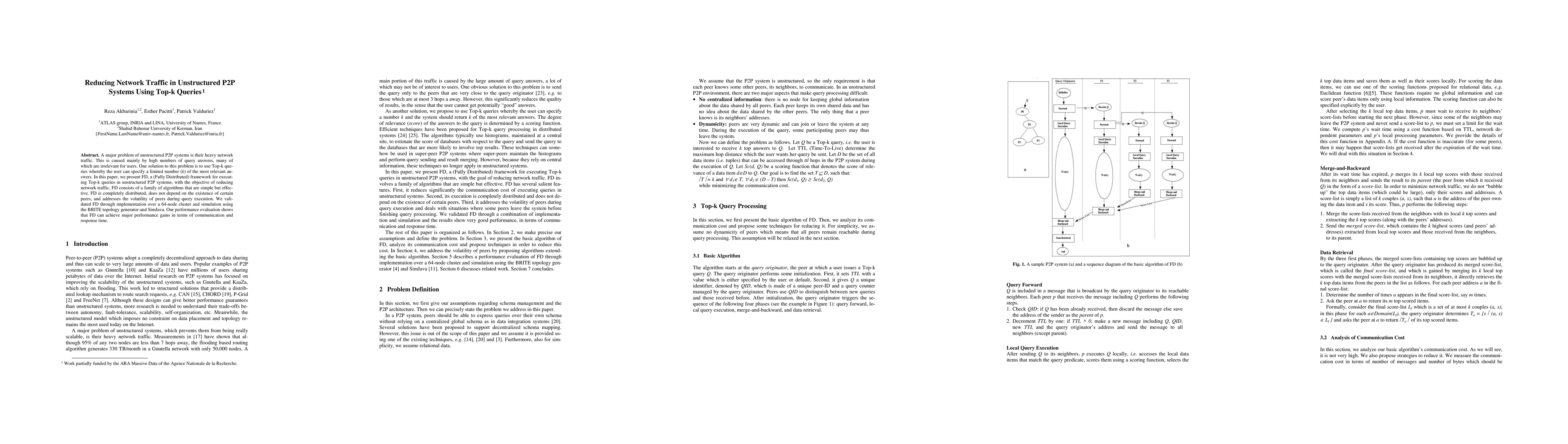 This paper proposes FD, a fully distributed framework for executing Top-k queries in unstructured P2P systems to reduce network traffic by limiting the number of irrelevant query answers. FD's performance was validated through implementation and simulation, demonstrating significant improvements in communication and response time.